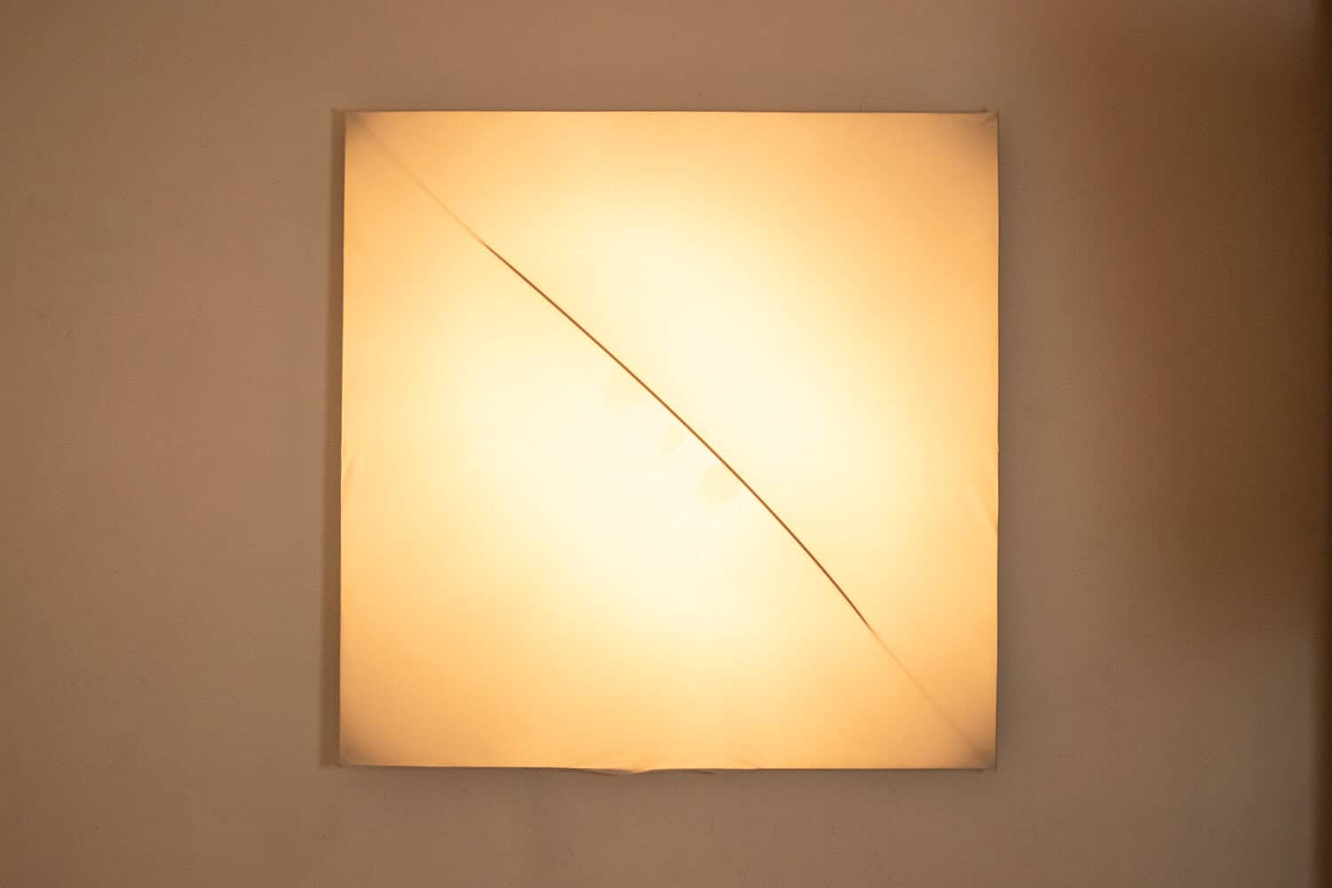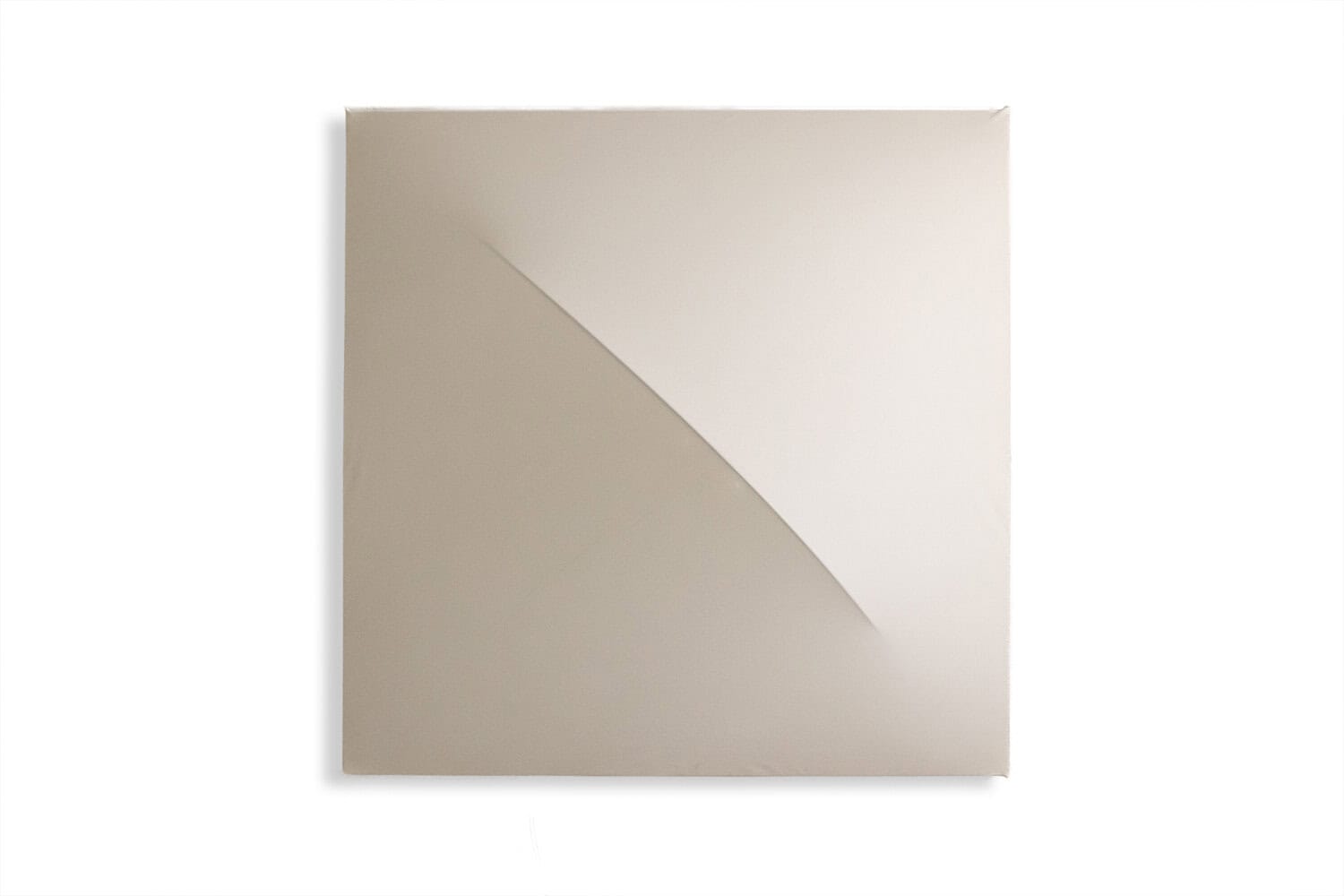 Applique de style Moderniste de forme carrée, tissu de couleur blanche reposant sur armature métallique.