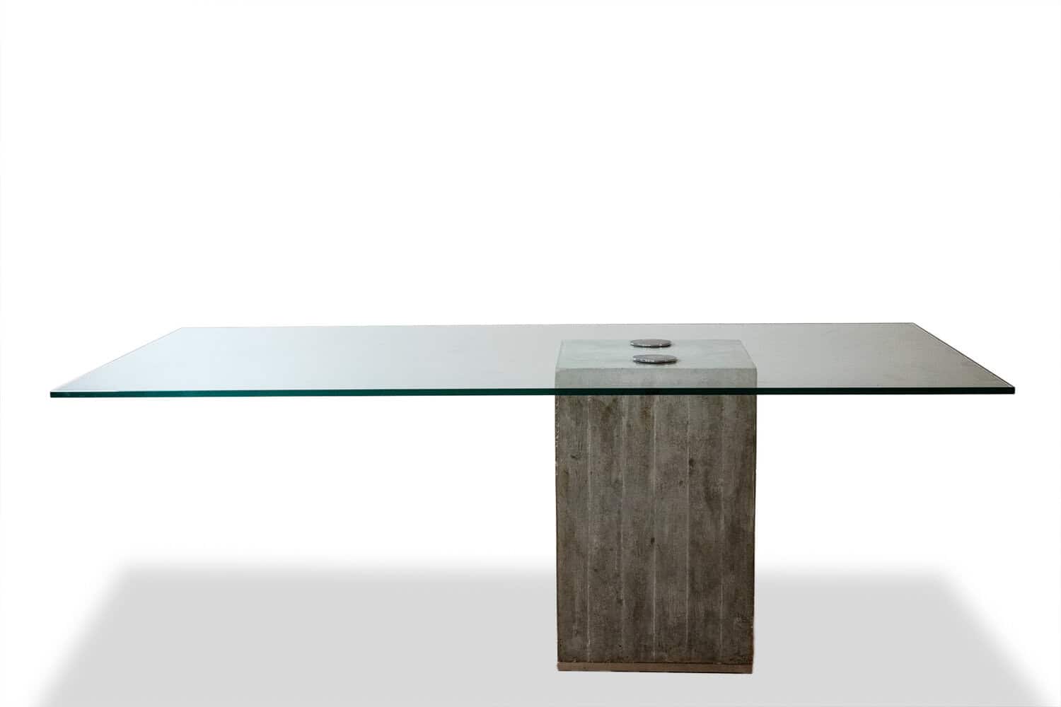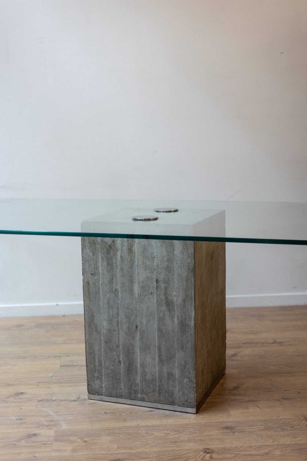 Bureau rectangulaire de style Brutaliste et Minimaliste, composé d’un plateau de verre reposant sur une base en béton brut.