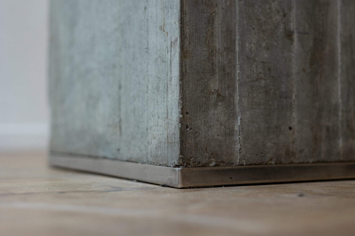 Finition de la base en béton et boulons de fixation du plateau en métal chromé.