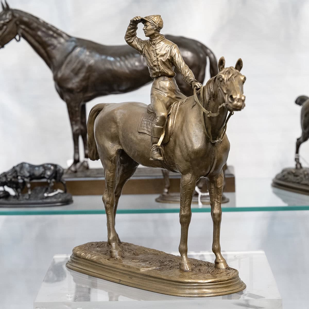 A bronze sculpture with a medal patina , depicting a jockey on horseback , by the sculptor Jules Moigniez (1835-1894) .