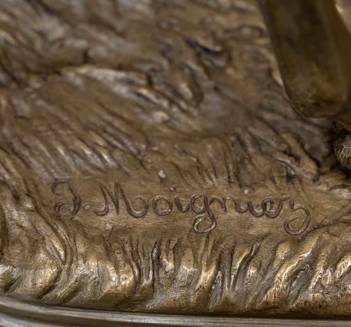 Bronze titré , « Avant la Course » et signé « J.Moigniez » , en creux sur la terrasse naturaliste , à contre-socle mouluré .