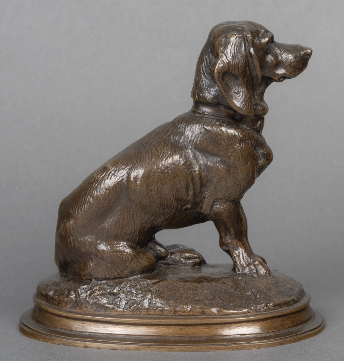Épreuve en bronze à patine brune , figurant le basset assis « Ravageot » , issu du groupe « Ravageot et Ravageode » , célèbres bassets de Napoléon III , exposés au Salon de 1853 , par le sculpteur Emmanuel Frémiet (1824 -1910) .