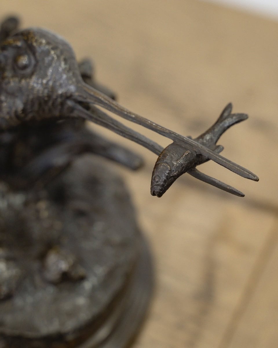 A bronze sculpture with a brown patina , depicting a woodcock ready to take flight after catching a fish , which it proudly holds in its long beak , by the sculptor Jules Moigniez (1835-1894) .