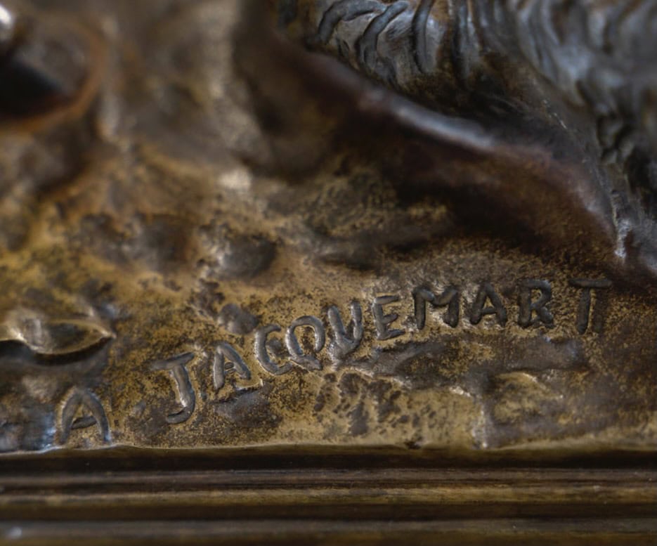 Signature du sculpteur « A.JACQUEMART » , en creux sur la terrasse naturaliste , richement ciselée et ornée .