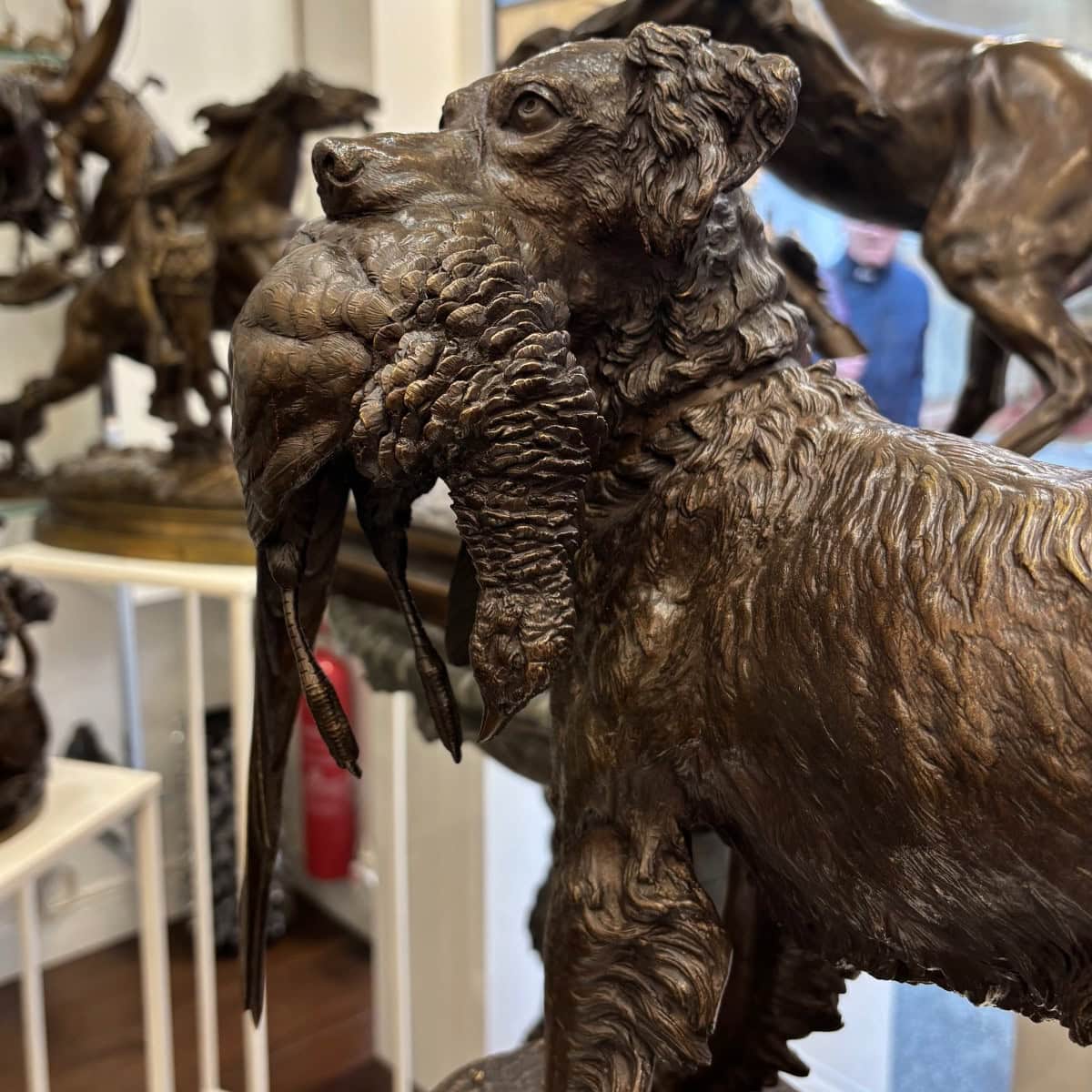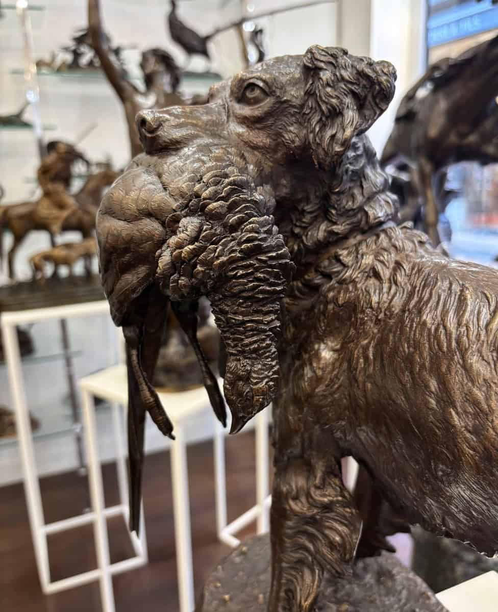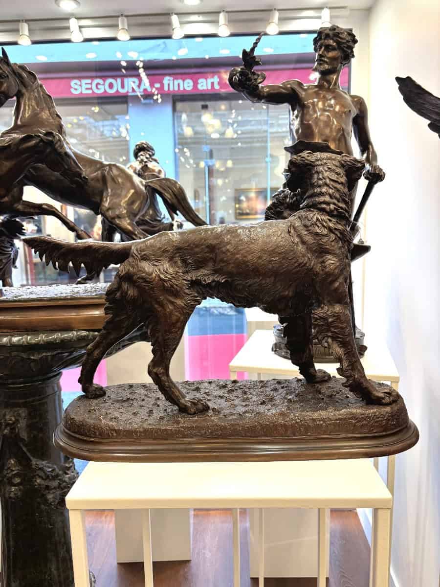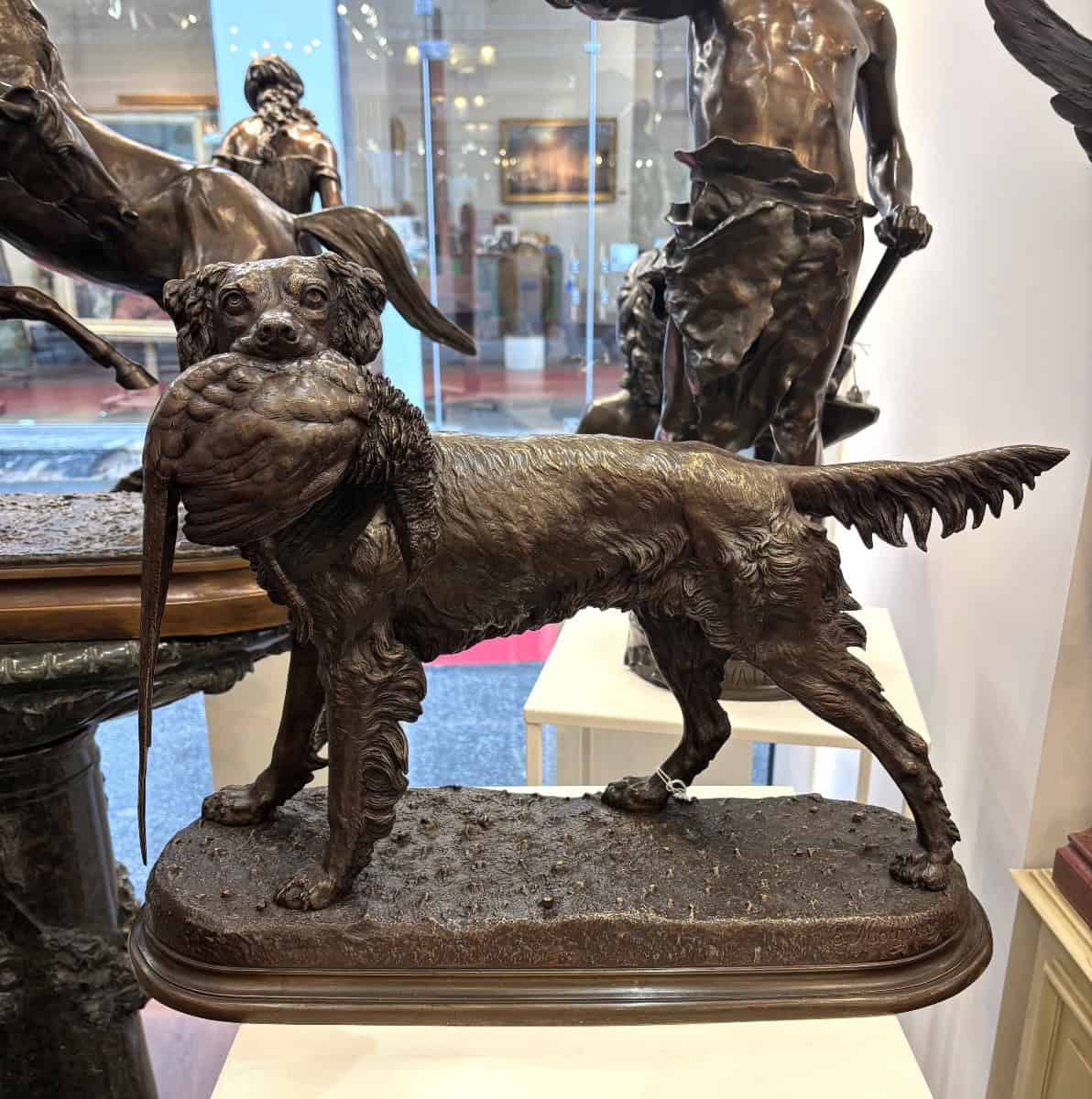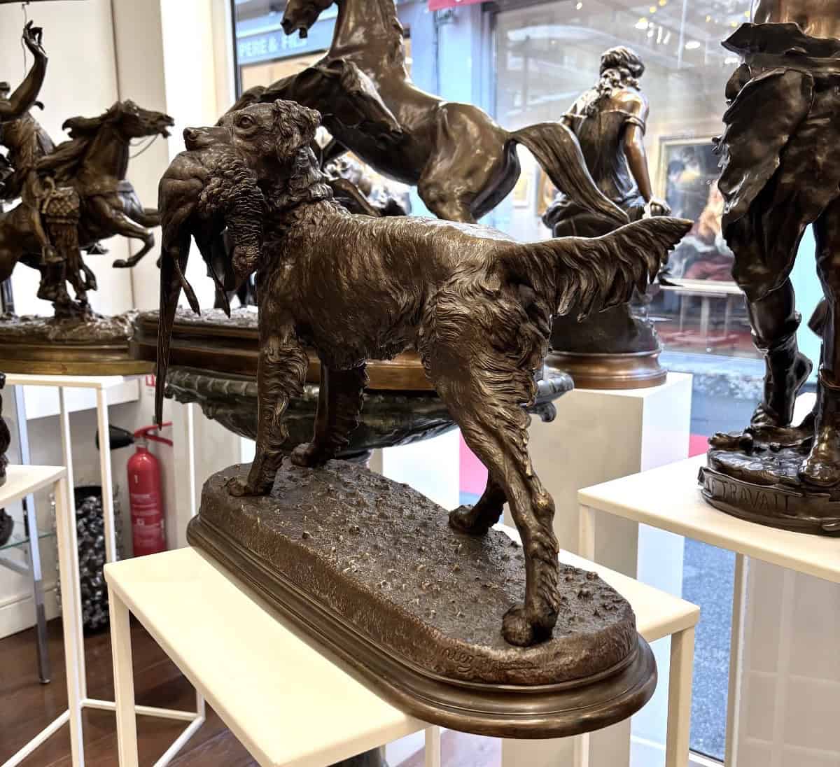 Importante épreuve en bronze à patine brune , figurant un chien de chasse de race « Setter » , rapportant fièrement sa proie , un faisan synonyme de trophée , par le sculpteur animalier Jules Moigniez (1835-1894) .