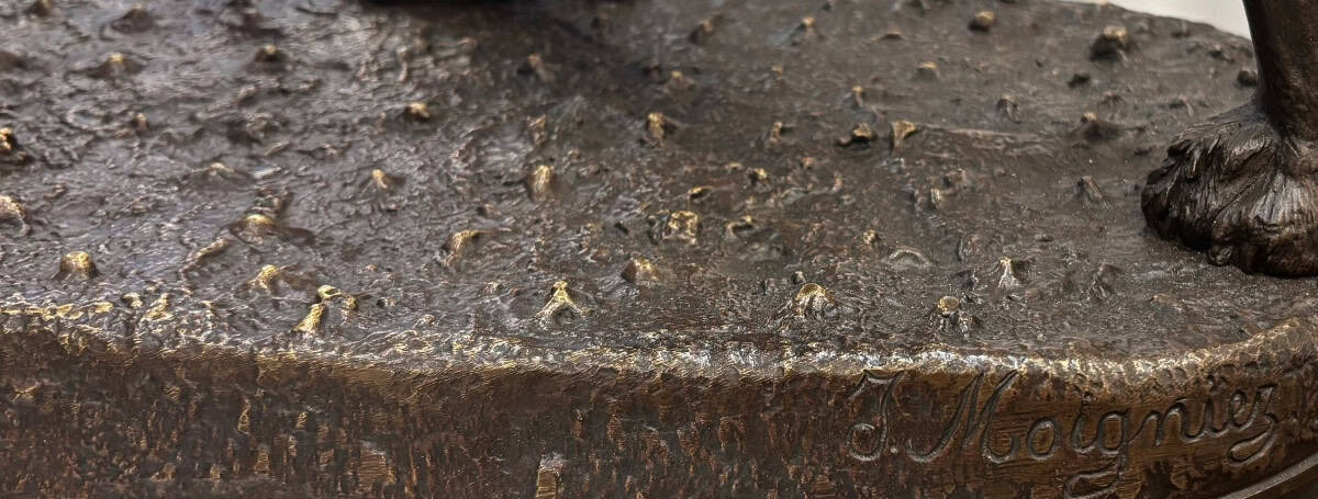 Signature du sculpteur « J.Moigniez » en creux , sur la terrasse naturaliste , richement ciselée .