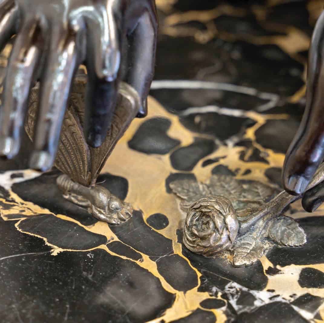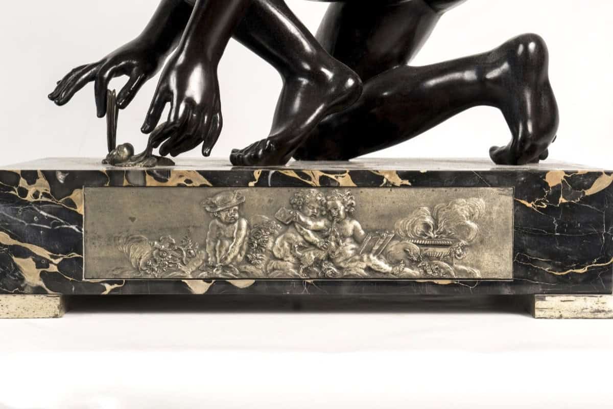 L’ensemble repose sur un socle en marbre noir , décoré d’un bas-relief en bronze illustrant des angelots , ce qui accentue la richesse de l’œuvre et met en valeur le contraste entre les différents matériaux et patines .