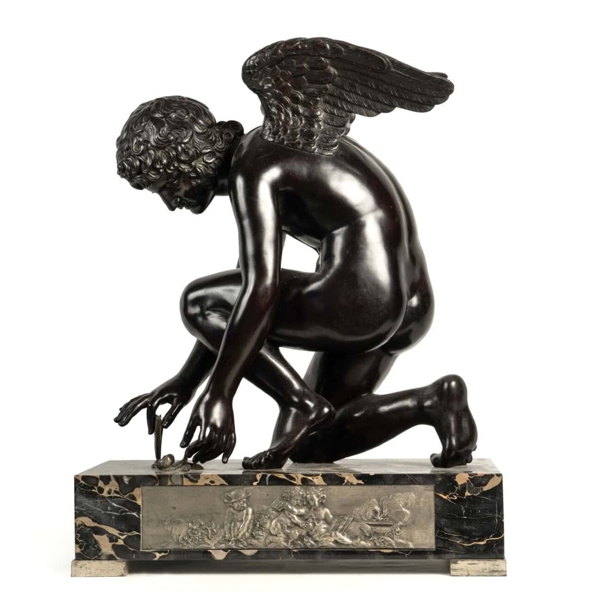 The piece rests on a black marble base , decorated with a bronze bas-relief depicting cherubs , which accentuates the richness of the work and highlights the contrast between the different materials and patinas .