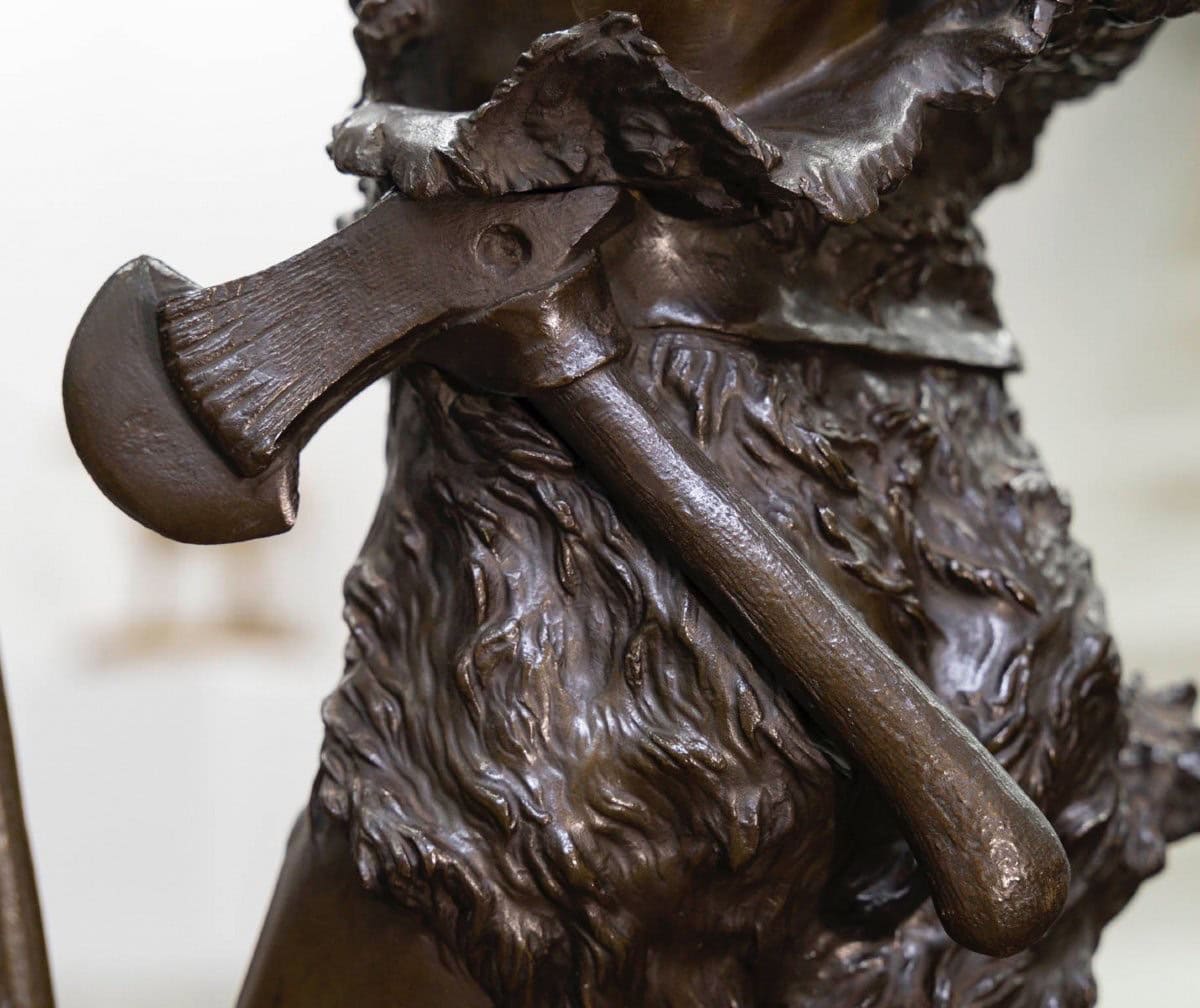Il est armé de sa lance et d’une hache . La puissance et la virilité de l’homme sont ici mises en avant .