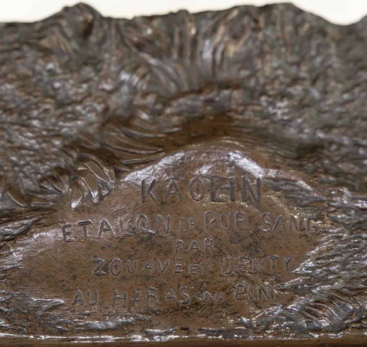 The bronze is titled « KAOLIN ETALON PUR-SANG PAR ZOUAVE ET DENTY AU HARAS DU PIN » (KAOLIN Thoroughbred Stallion by Zouave and Denty at the Haras du Pin) , in the center of the base .