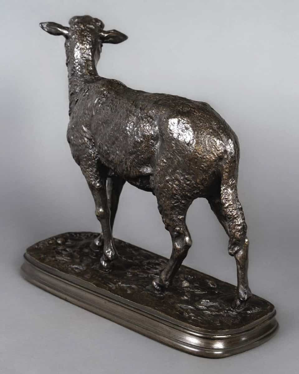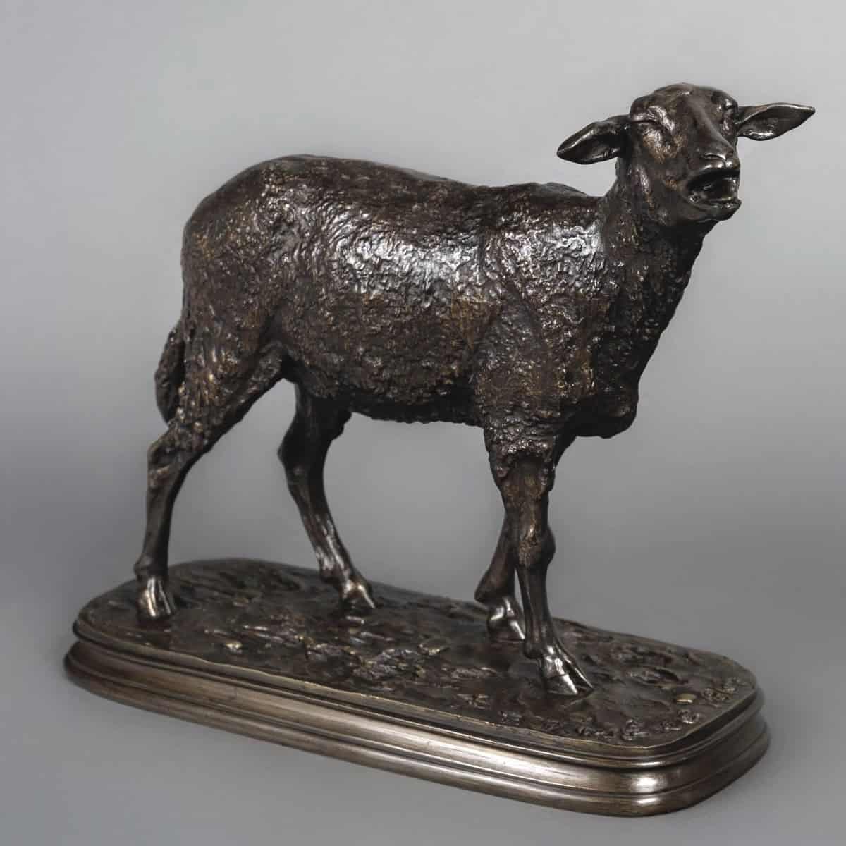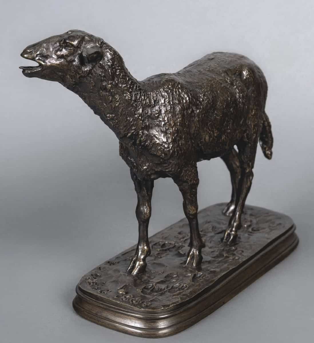 Épreuve en bronze à patine brune , figurant un mouton debout , nommé « Mouton des Vosges » , par le sculpteur Pierre – Jules Mêne (1810-1879) .