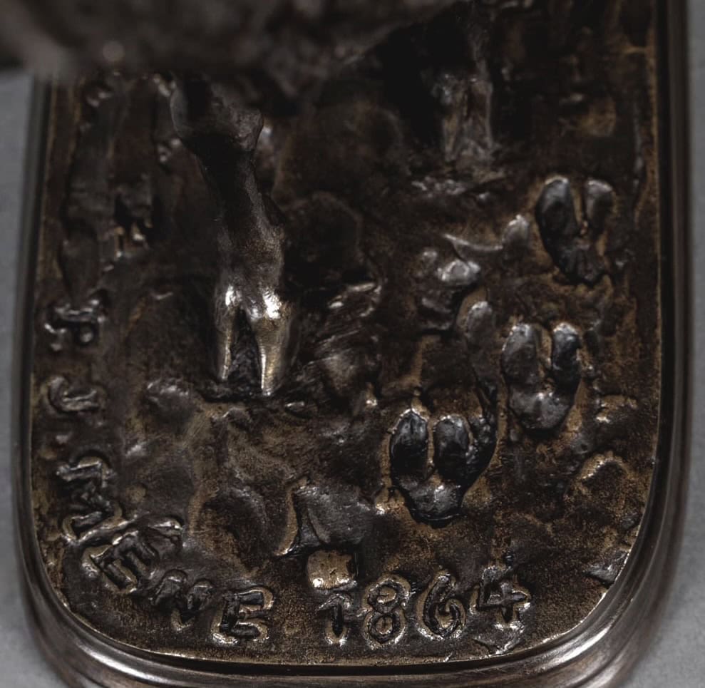 Signature du sculpteur « P.J.MÊNE » , suivie de la date « 1864 » , en creux sur la terrasse naturaliste , richement ciselée , enrichie d’un profil .