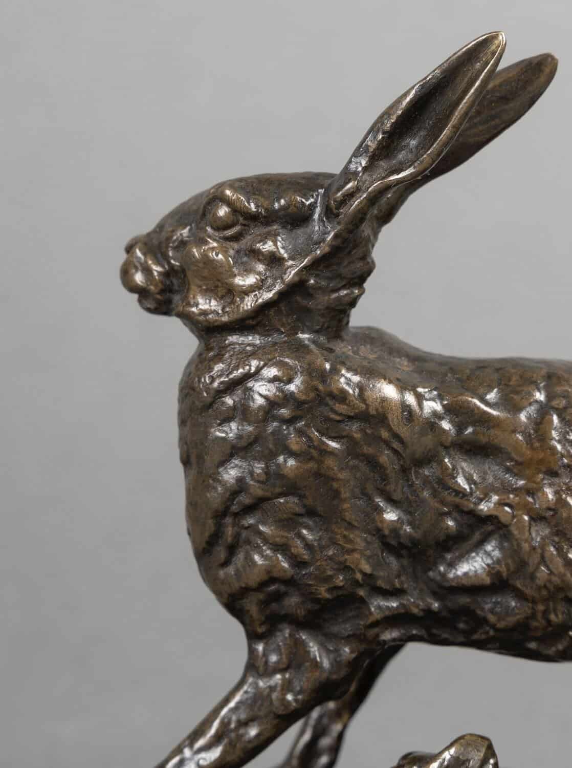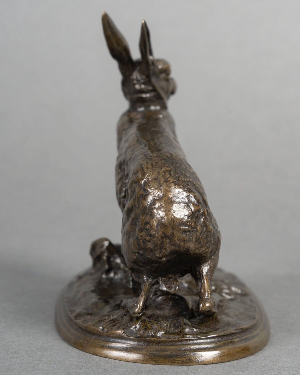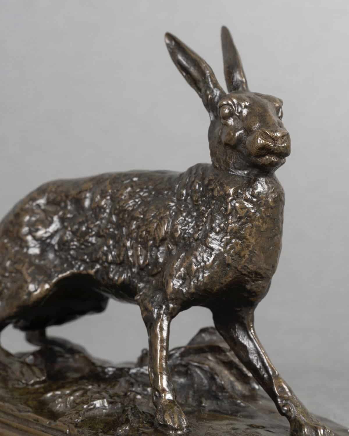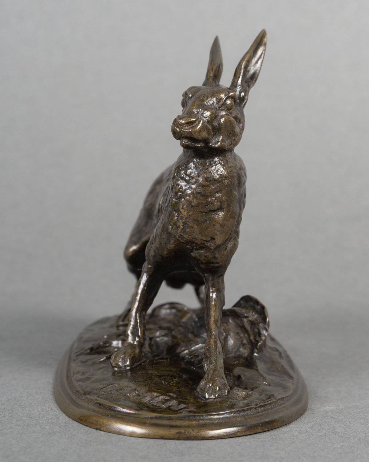 Épreuve en bronze , à patine brune , figurant un lièvre au repos , présenté en attitude d’observation , par le sculpture Pierre – Jules Mêne (1810-1879) .