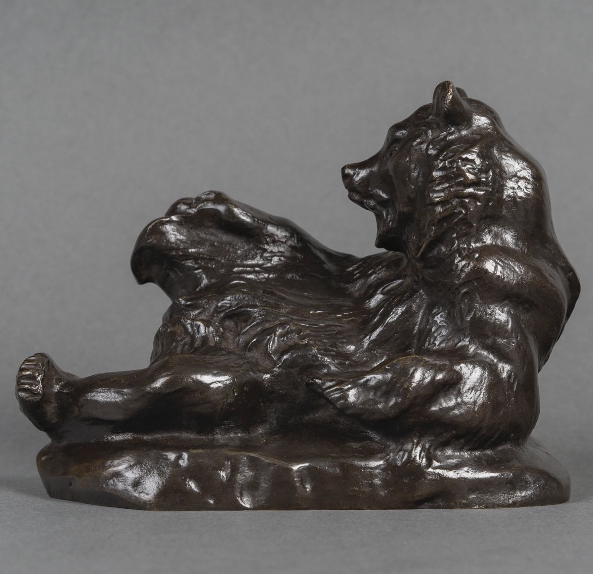 A bronze sculpture with a brown patina, depicting « The Reclining Bear » , an emblematic work , by the sculptor Antoine-Louis Barye .