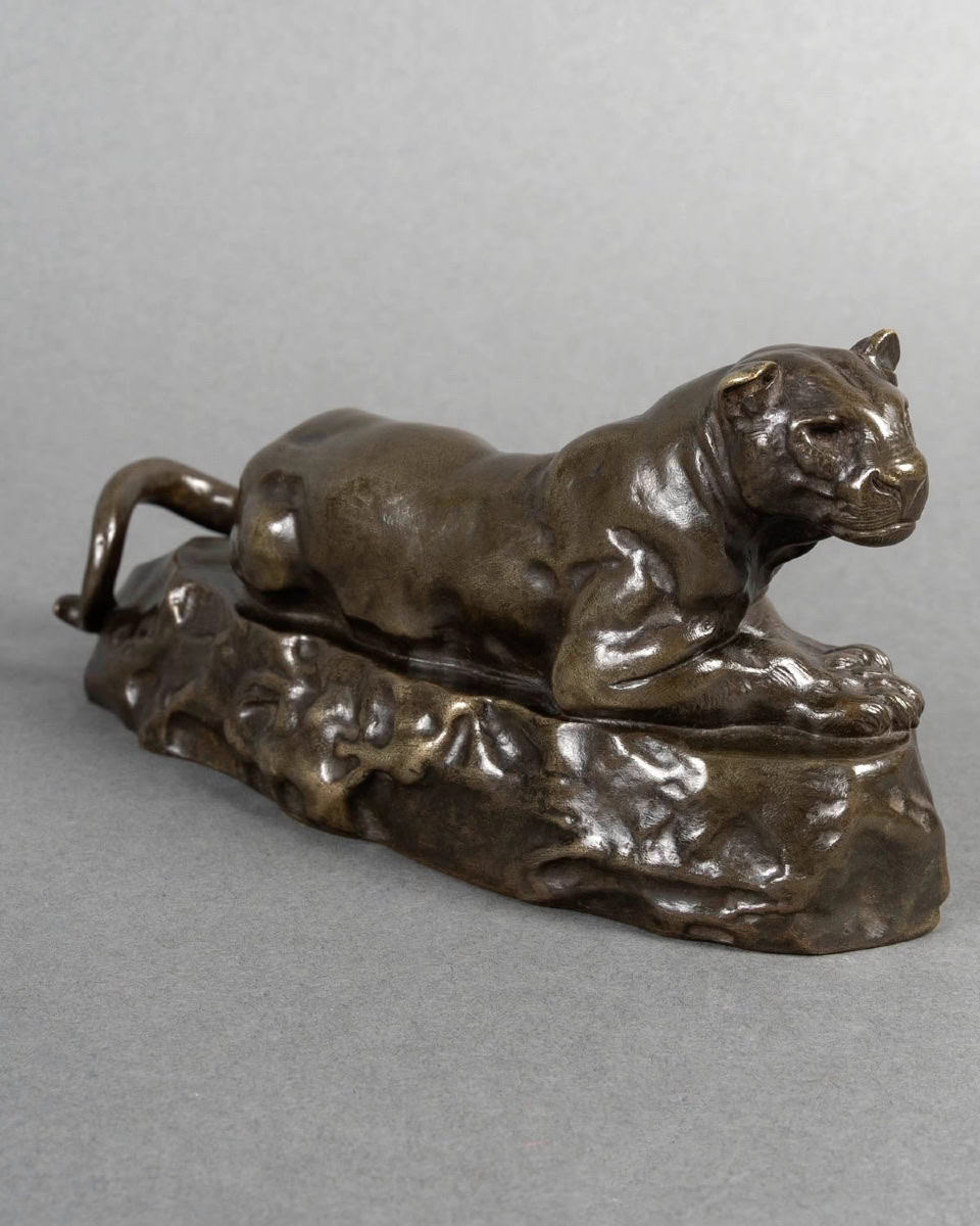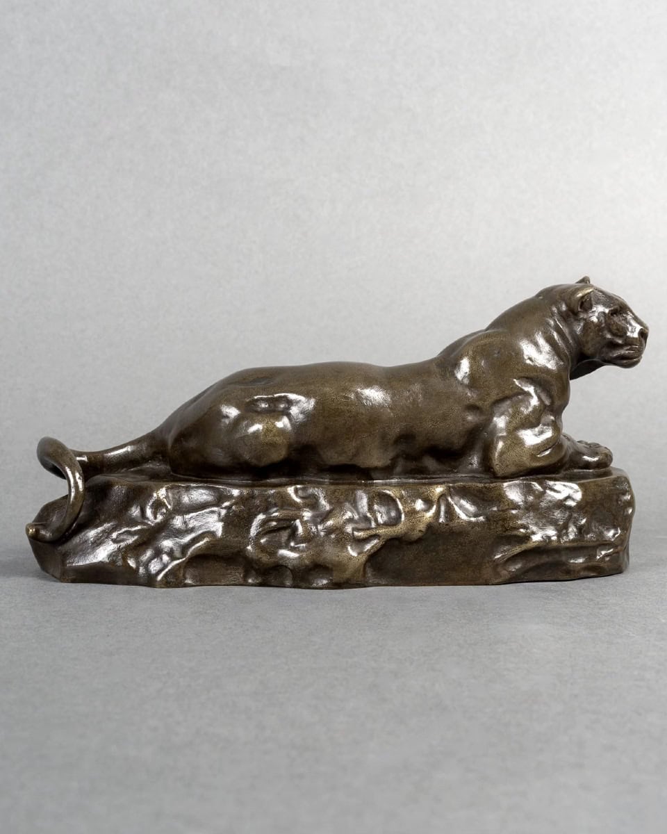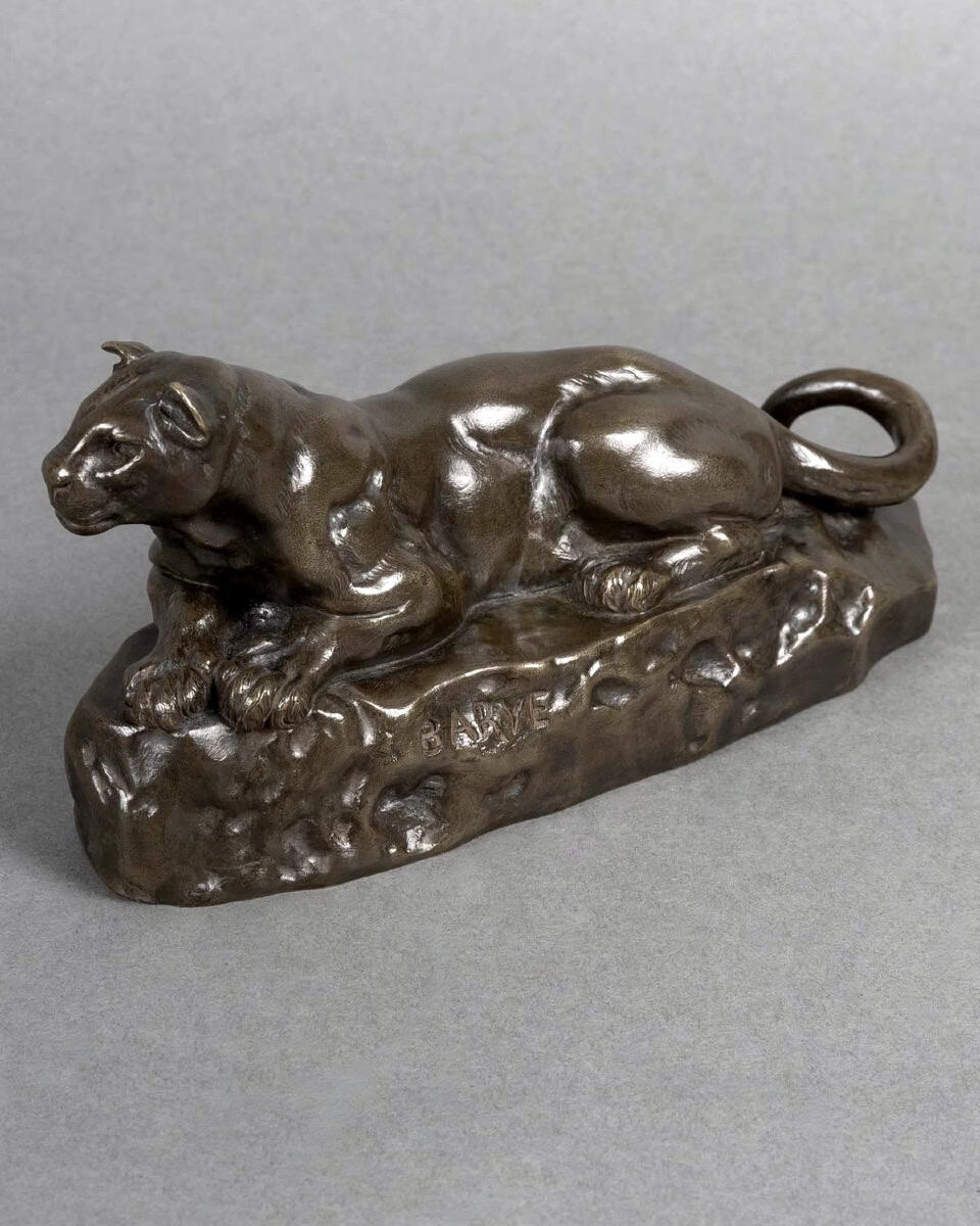 Bronze proof with greenish-brown patina , representing a panther « Panther of Tunis No. 2 » , Antoine – Louis Barye (1795-1875). The panther is shown at rest , observing the horizon , it is crouching on a naturalistic terrace representing a rock .