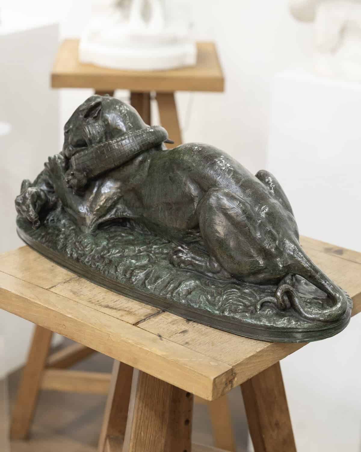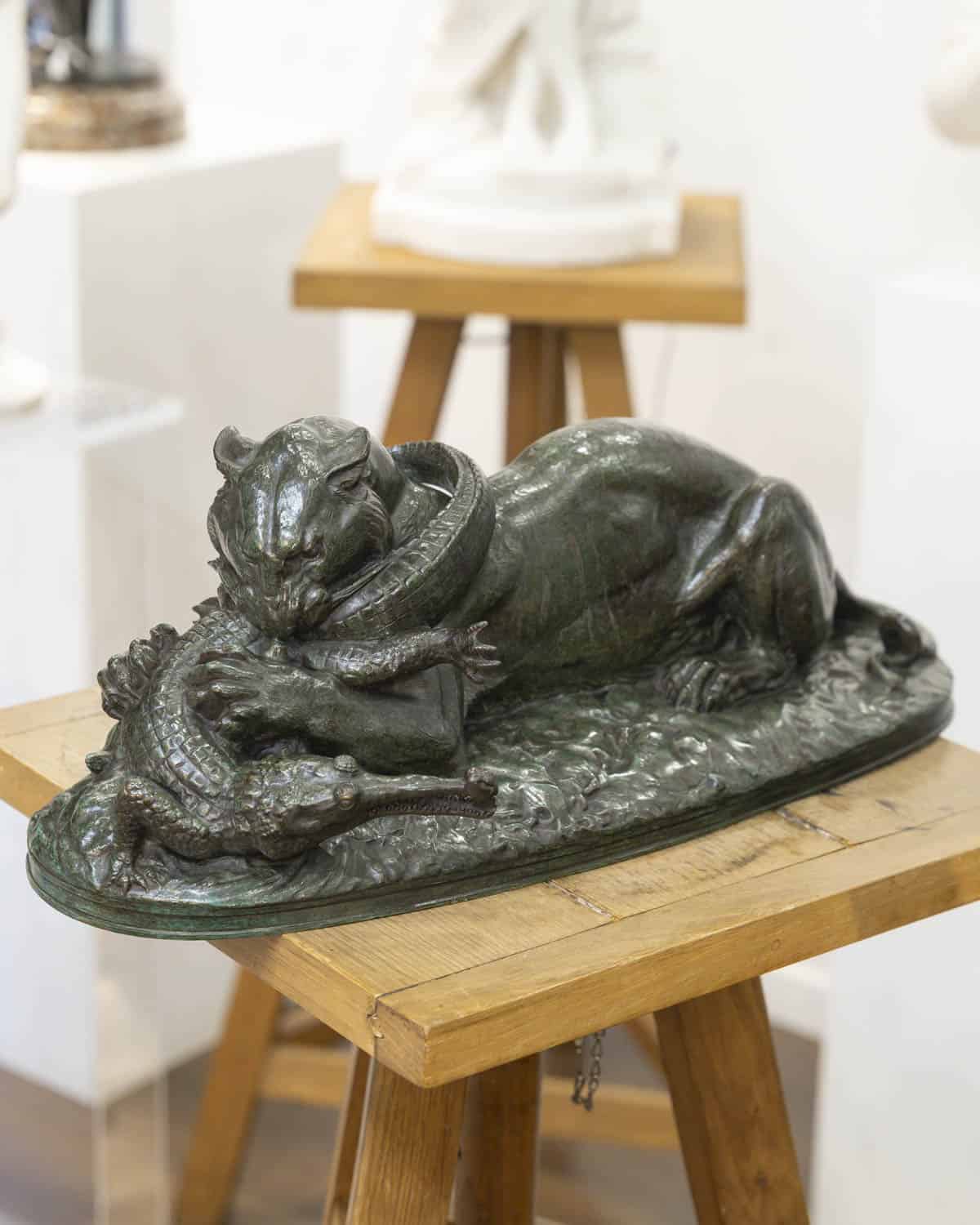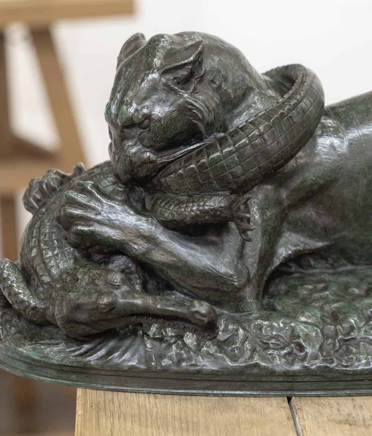 Groupe en bronze à patine verte , représentant un tigre dévorant un gavial, par le sculpteur Antoine-Louis Barye (1795-1875) .