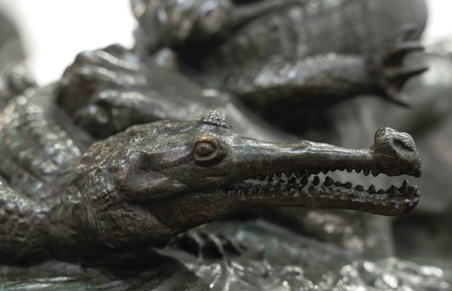 Le tigre figure mordant la queue du gavial , l’œuvre évoque le moment le plus tragique d’un combat animalier , celui où le prédateur dévore sa proie qui se défend encore dans un dernier instinct de survie .