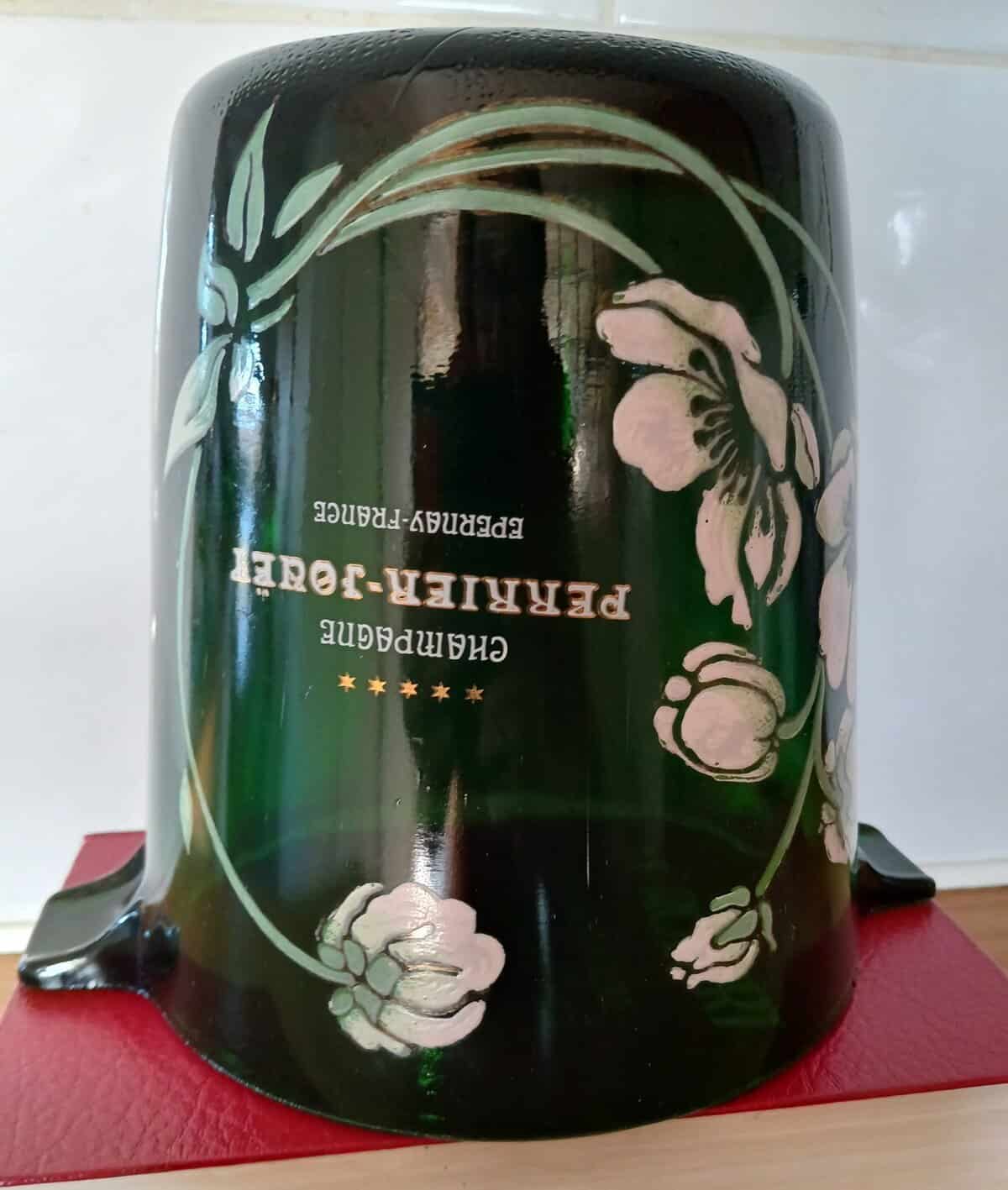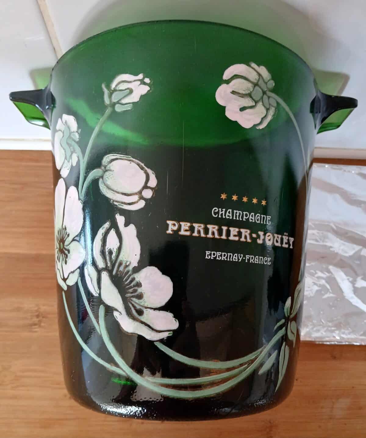 Seau à champagne en verre épais peint à la main. Art Nouveau , pour la maison PERRIER JOUËT (Epernay) décoré de motifs émaillés de fleurs anémones dessinés par Émile Gallé. En parfait état