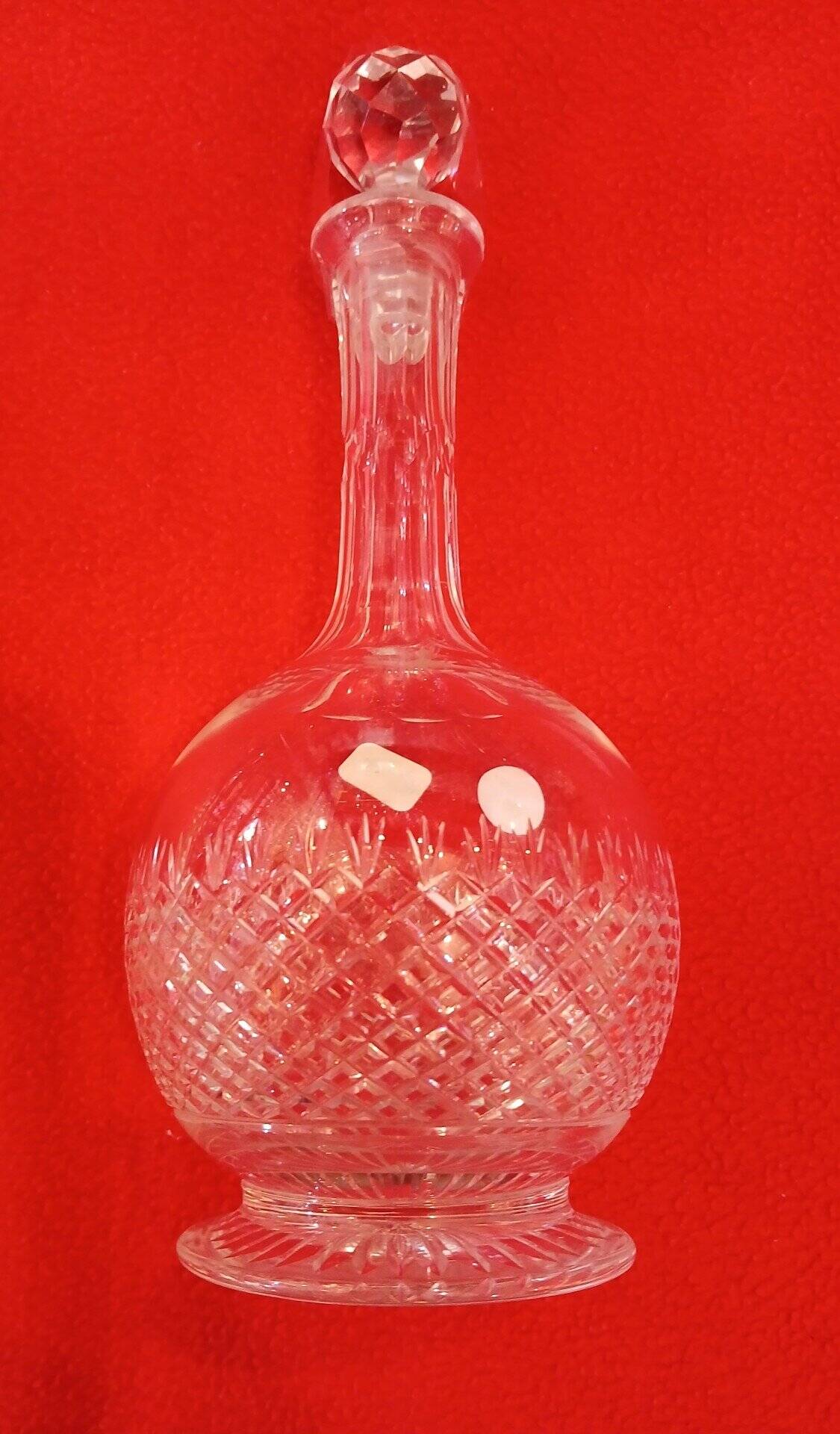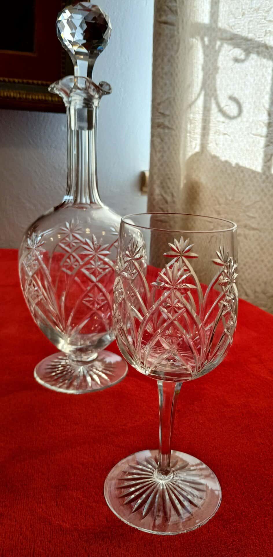 – H 17,5 cm, buvant 6,4 cm pied 7,7 cm. – Verre à vin blanc à 30 € pièce H 14 cm , buvant 5 cm, pied 6 cm – Verres à porto à 20 € pièce. H 12 cm, buvant 4 cm , pied 5,4 cm.- Carafes ; Hauteur avec bouchon pour les deux plus hautes : H : 33,5 cm à 140 € pièce et les deux autres : Hauteur 31 cm à 130 € pièce