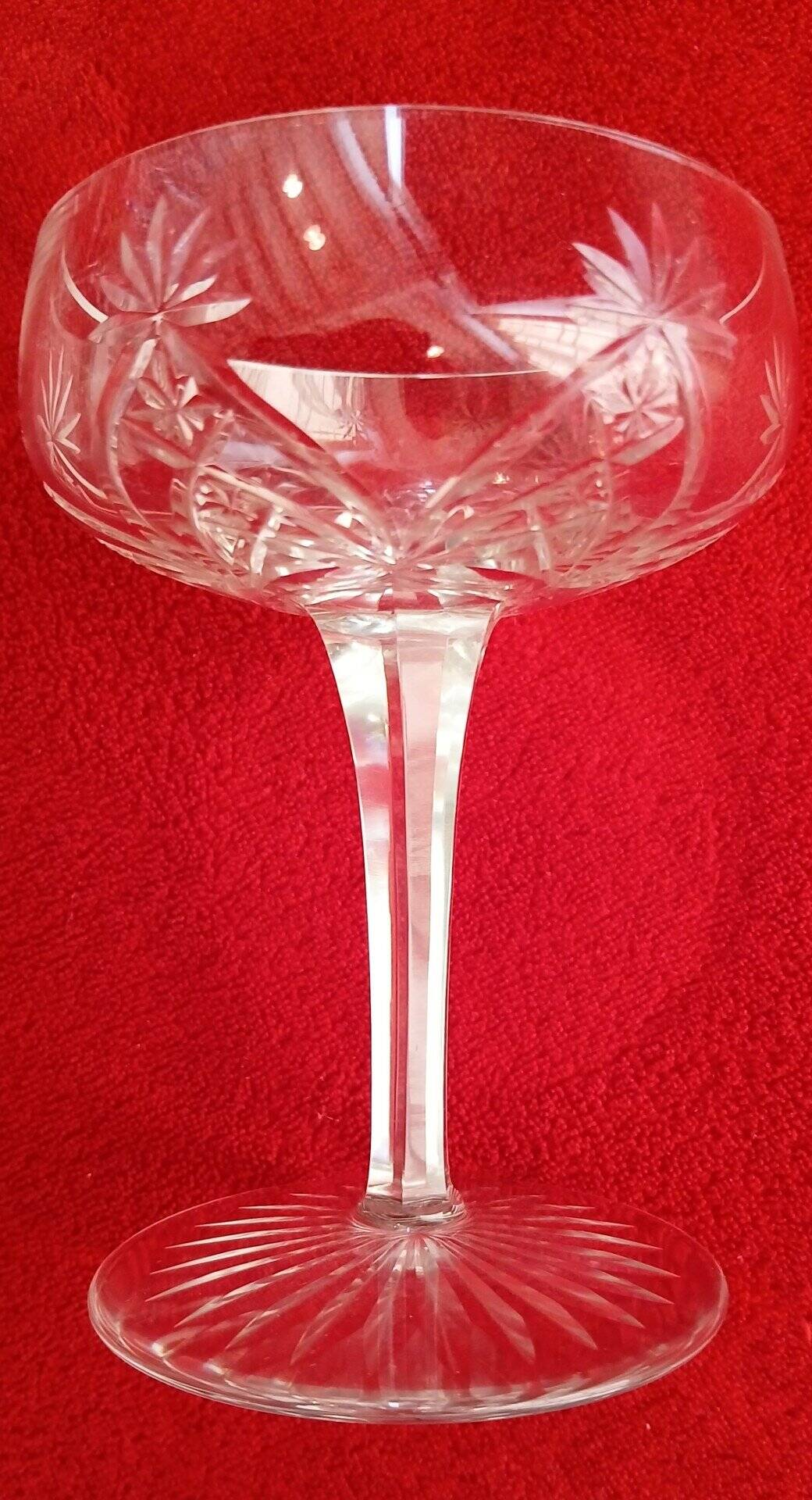 Coupes à champagne – H :12,5 cm, buvant : 9 cm., pied 7,8 cm à 45 € pièce .- Verre à eau à 45 € pièce