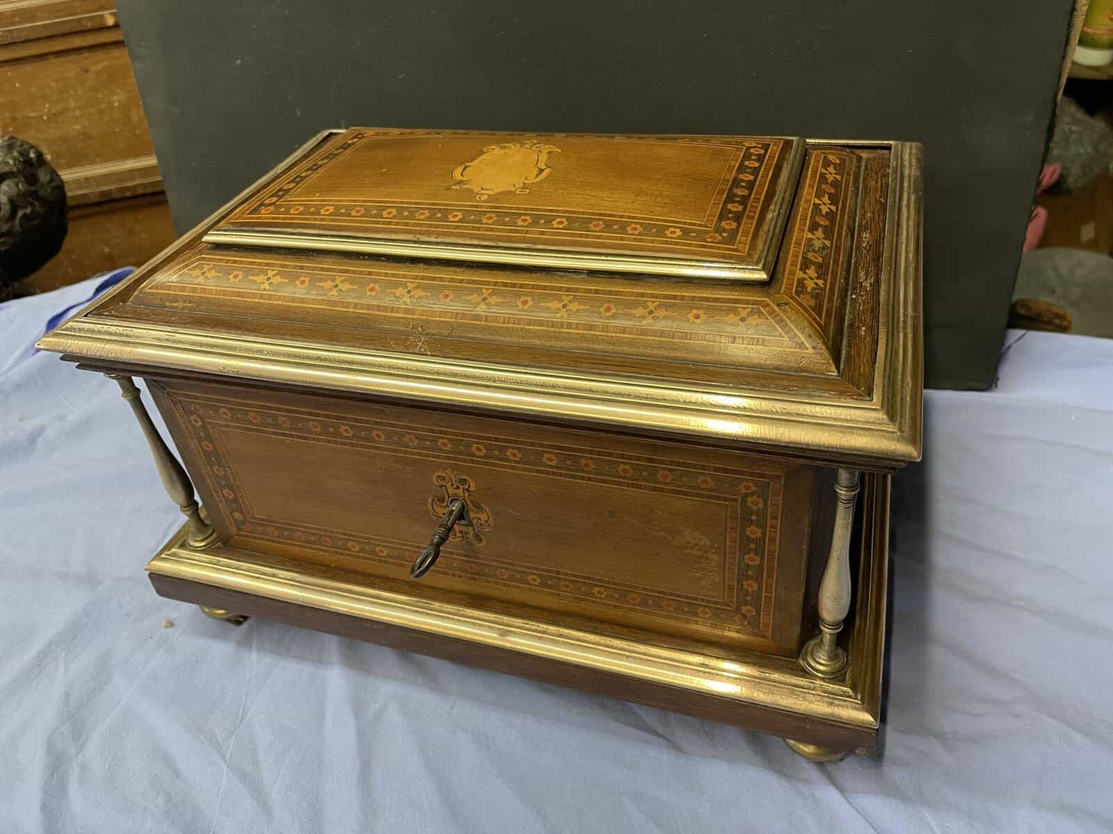 Il est posé sur quatre pieds en bronze et habillé de quatre colonnettes en bronze.Son couvercle est légèrement bombé d’origine.