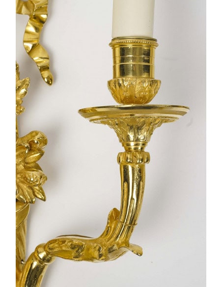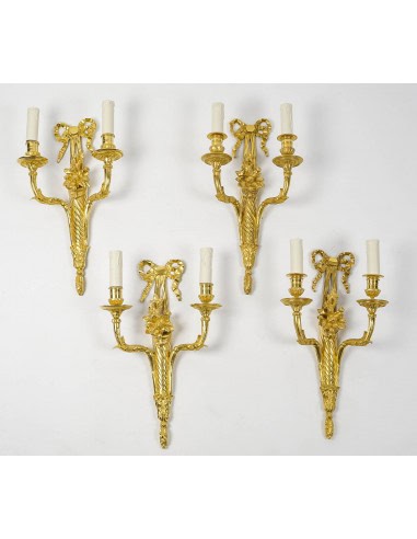 Ensemble de quatre très belles d’appliques de style Louis XVI en bronze à deux bras de lumière à décor de nœud rubané, de fleurs et de fruits.