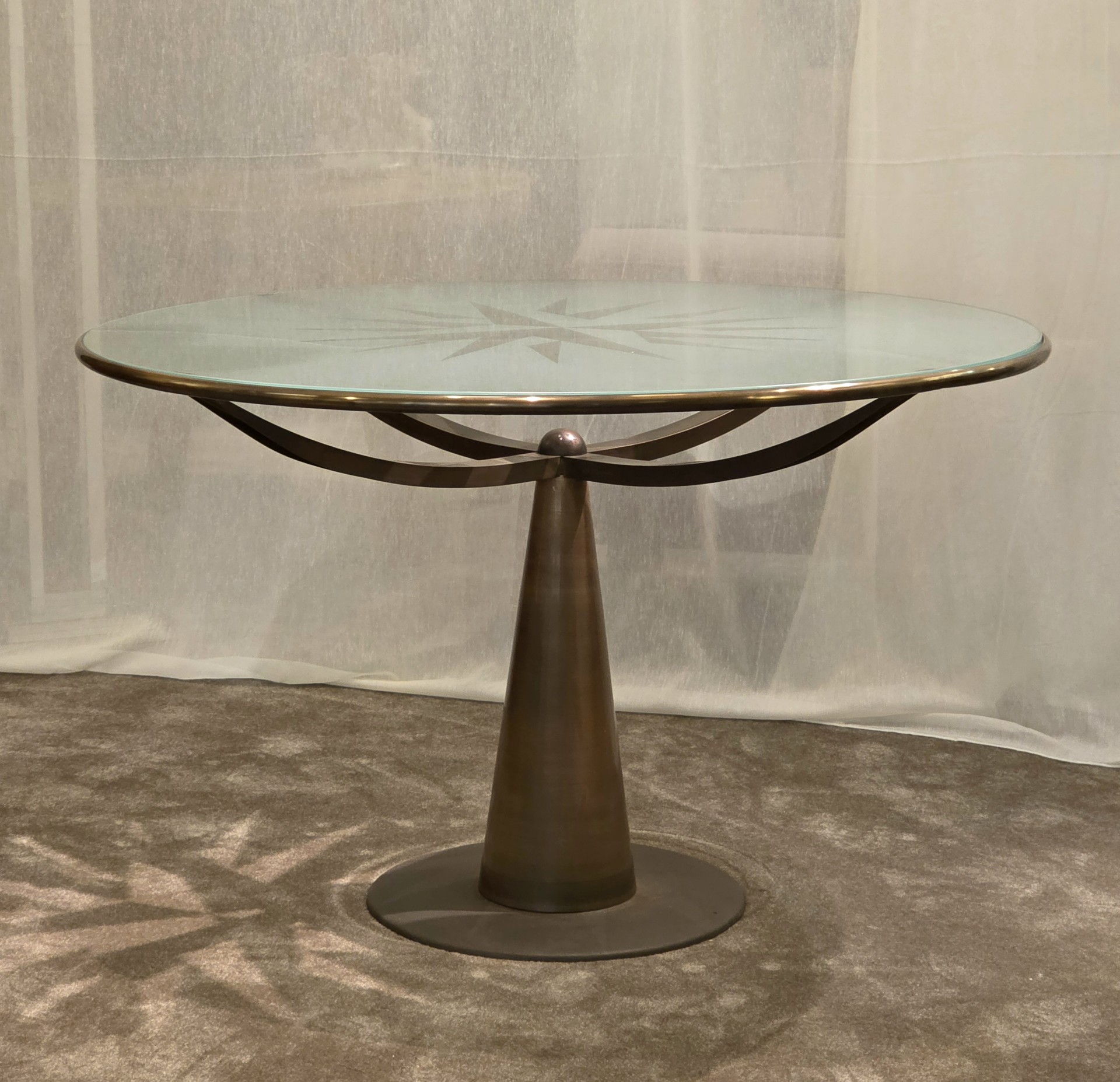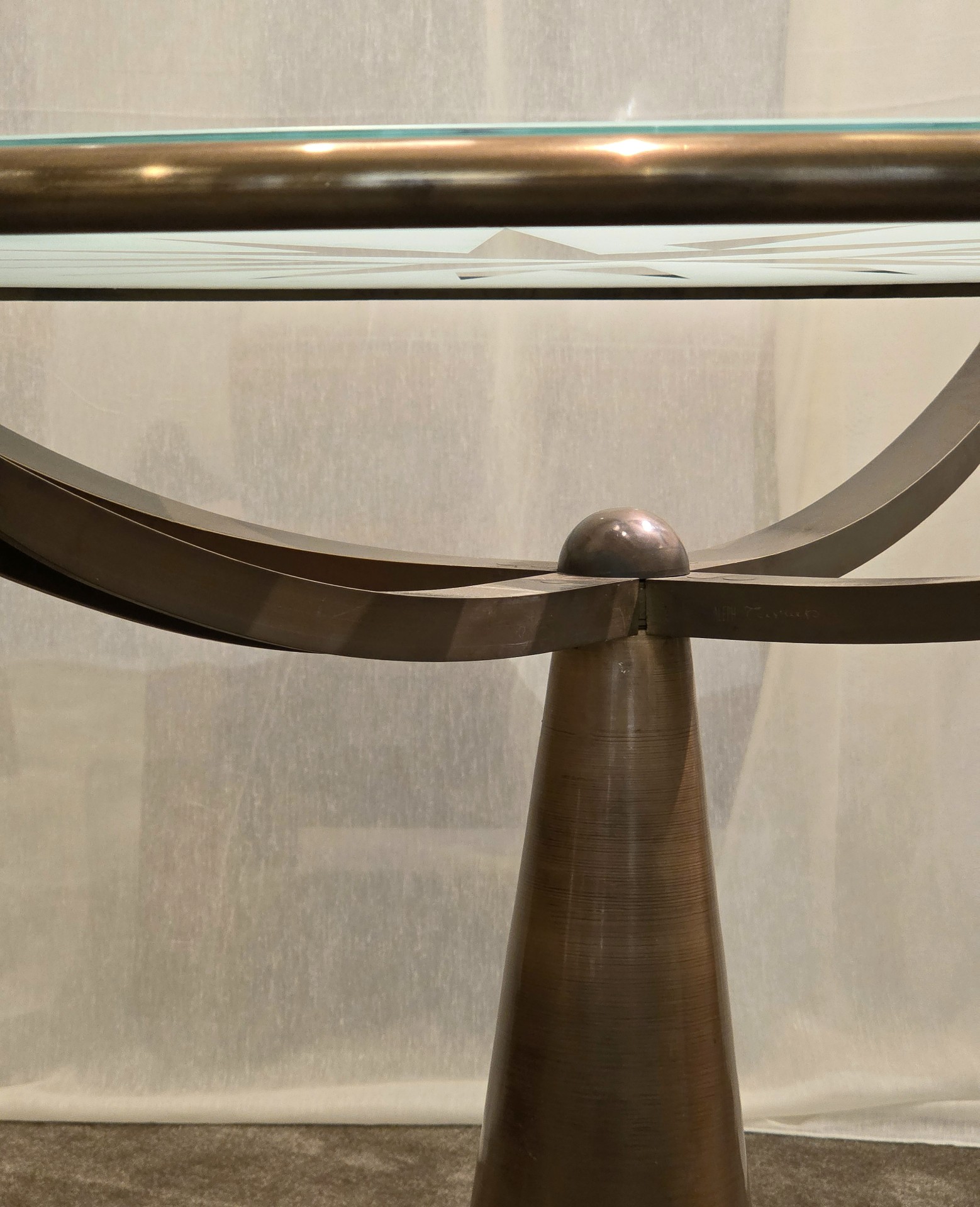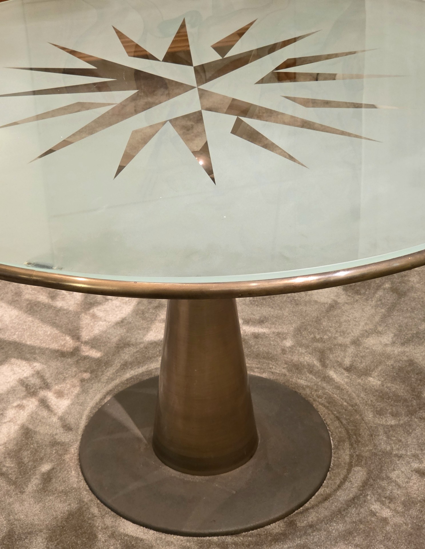 Travail en laiton métal et verre givré, sablé à décors d’une rose des vent.