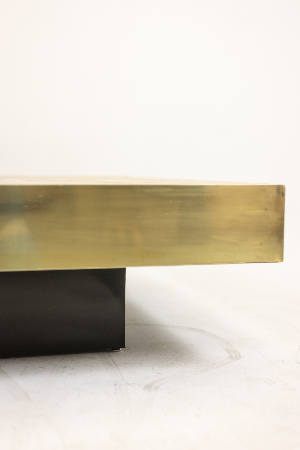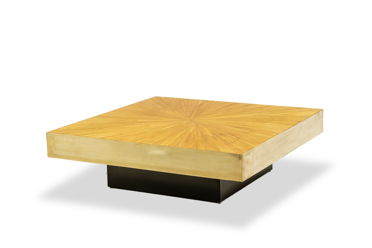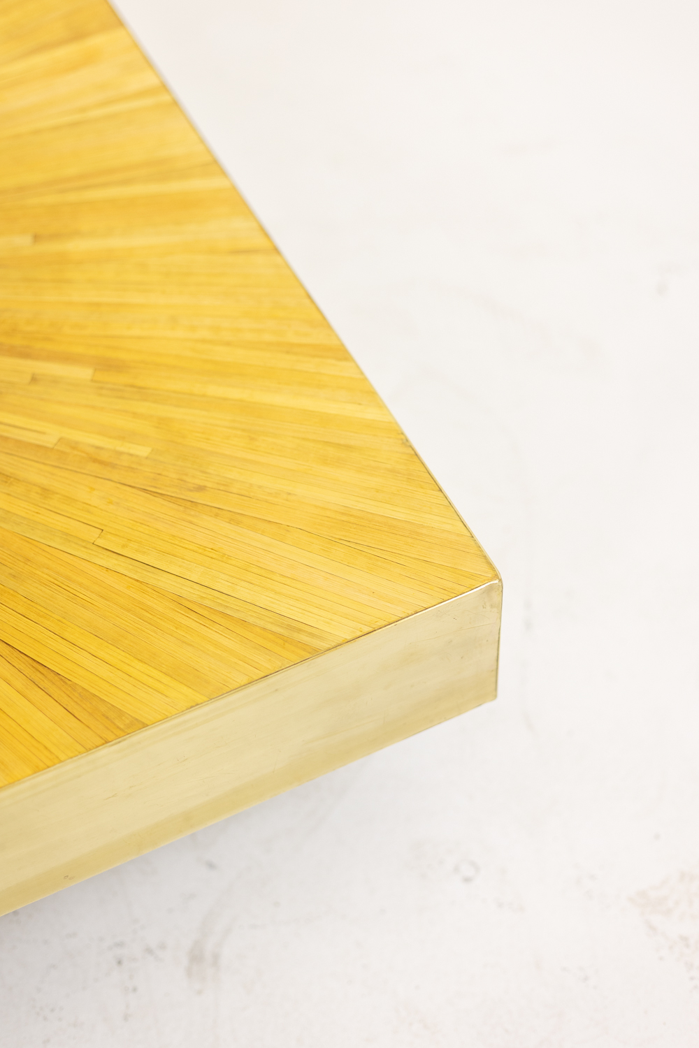 Table basse de forme carrée, avec son plateau contemporain en marqueterie de paille, cerclé de laiton doré mat et reposant sur une base laquée de couleur noire.
