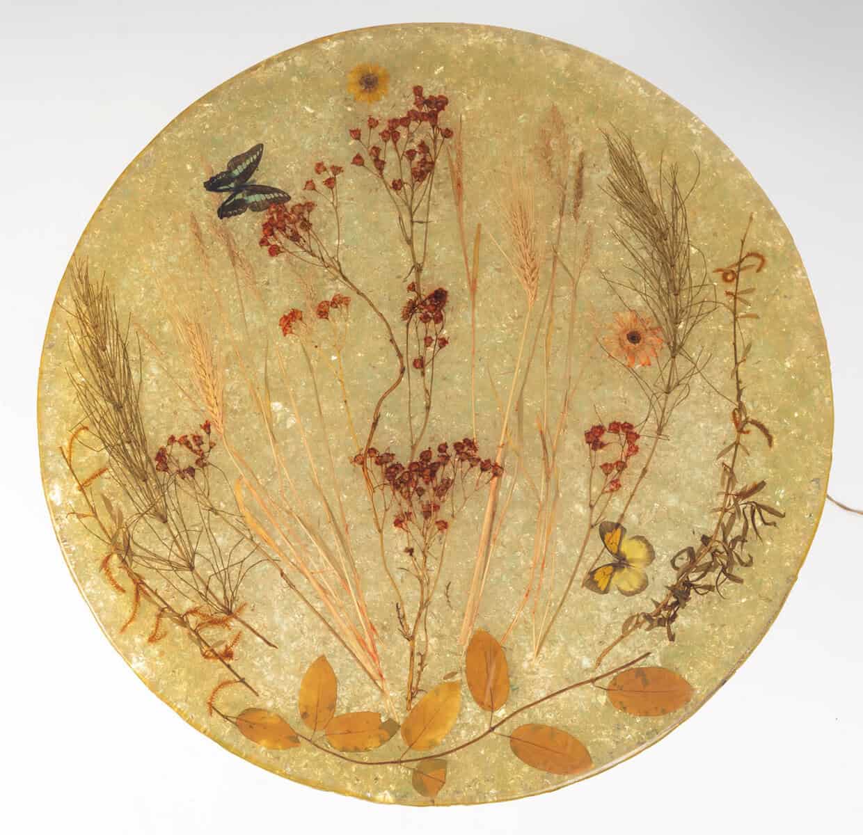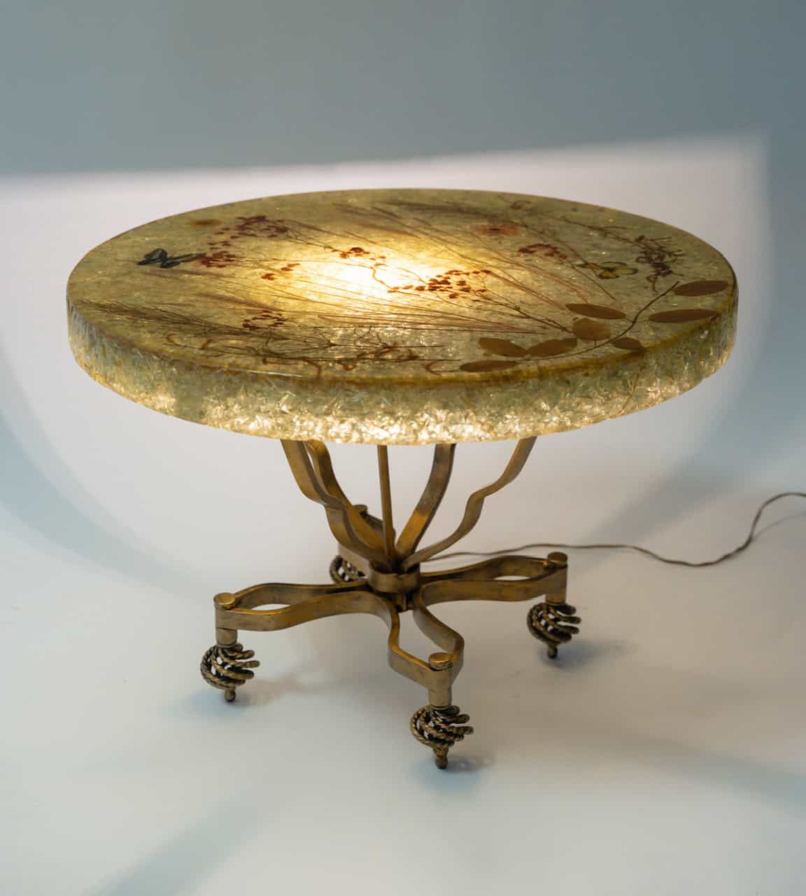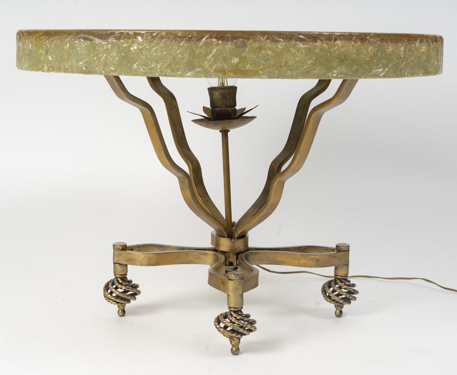 Table d’appoint avec plateau éclairé en résine, le pied en métal doré patiné.