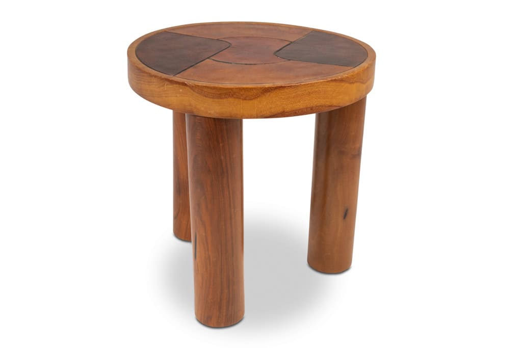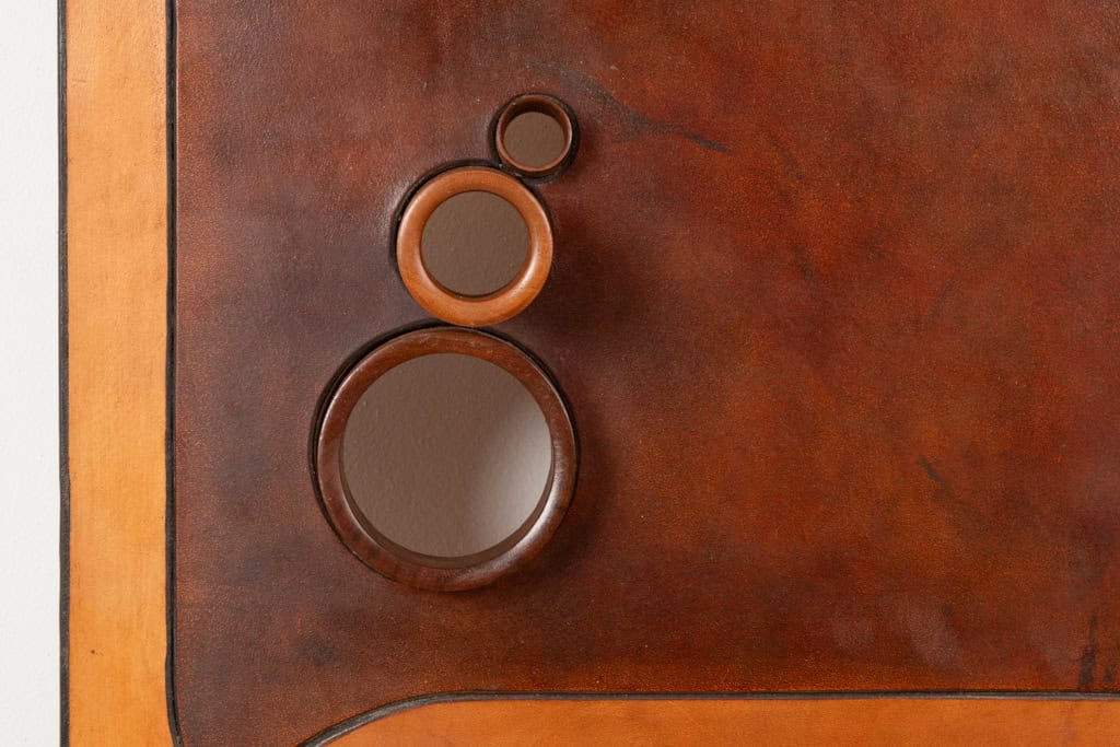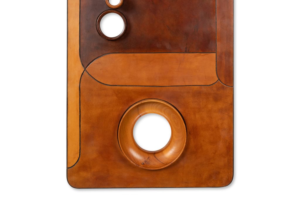 Ensemble en merisier et cuir patiné composé de 2 tabourets et d’une applique murale.