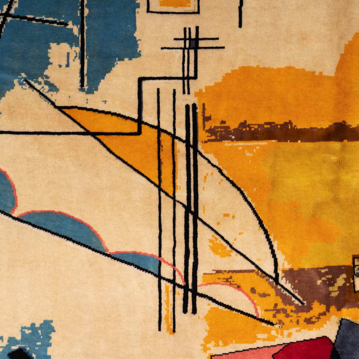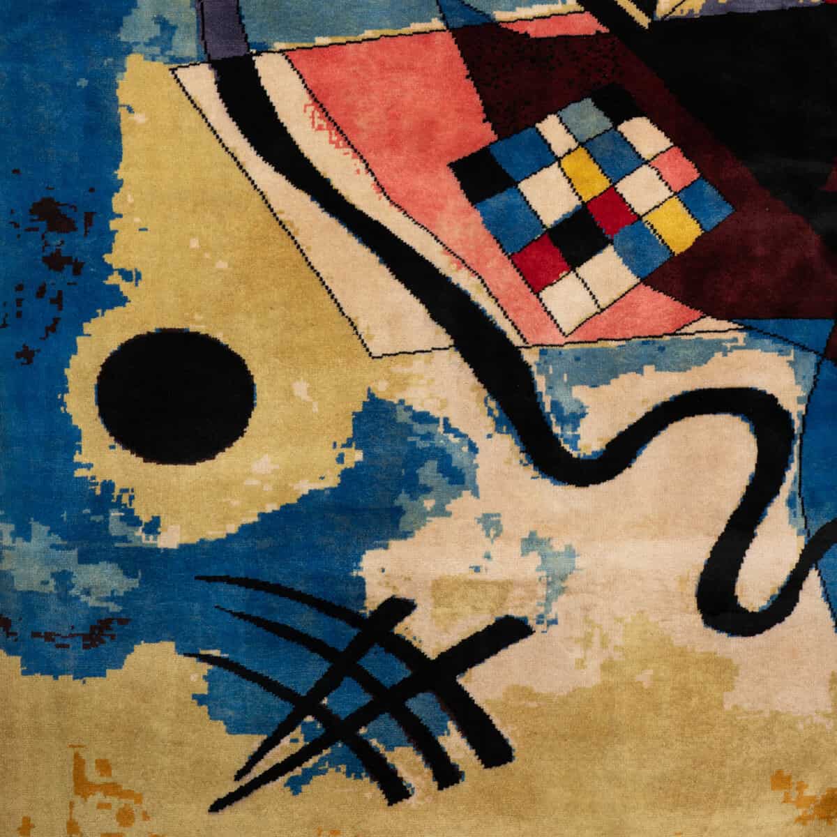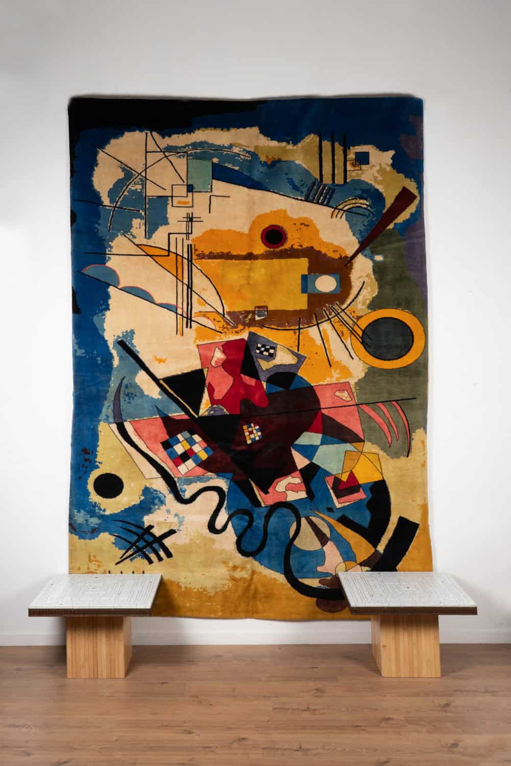 Tapis, ou tapisserie, inspiré par Wassily Kandinsky, abstrait et dans les tons bleu et jaune. Noué à la main et en laine Mérinos.