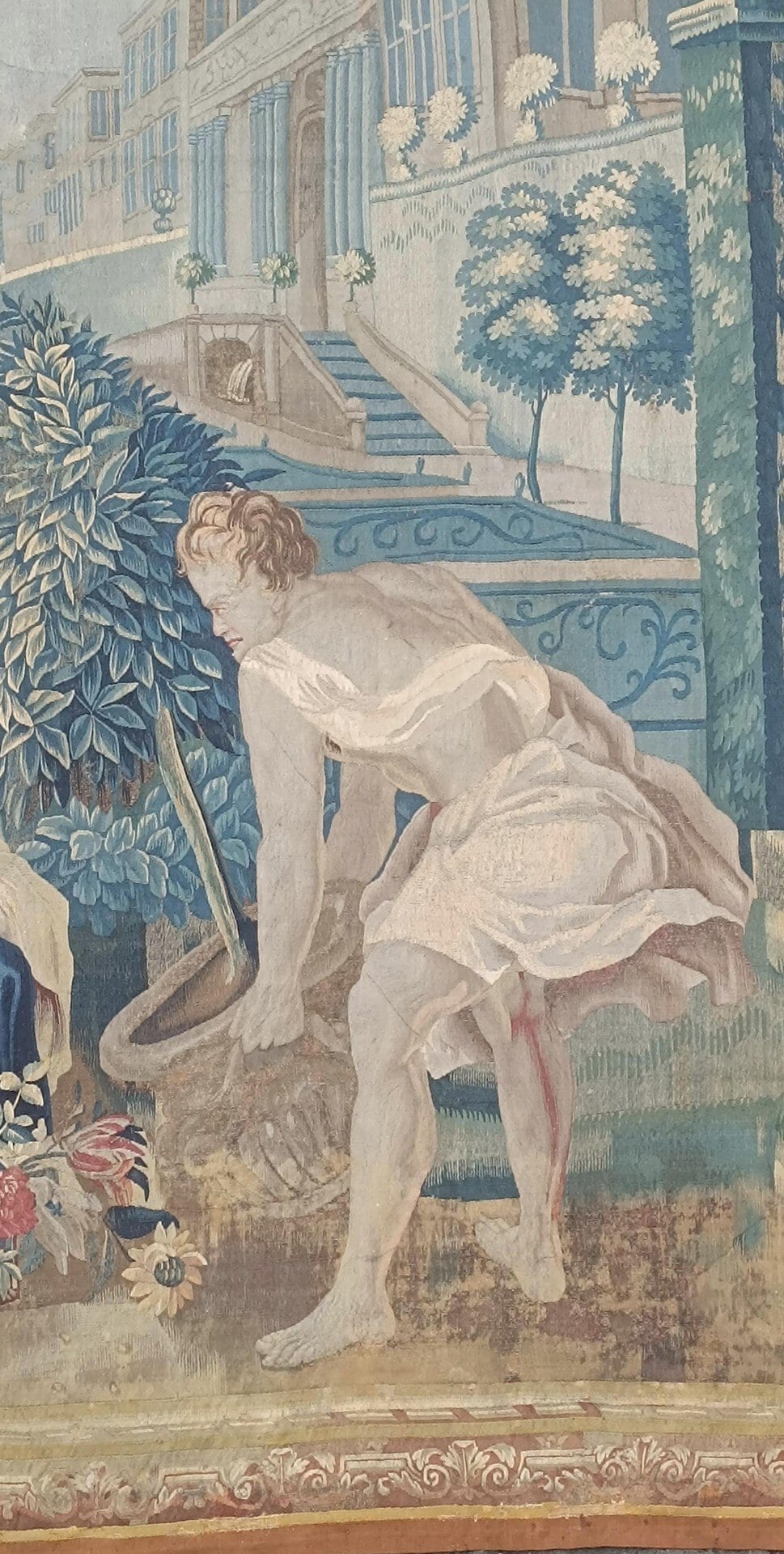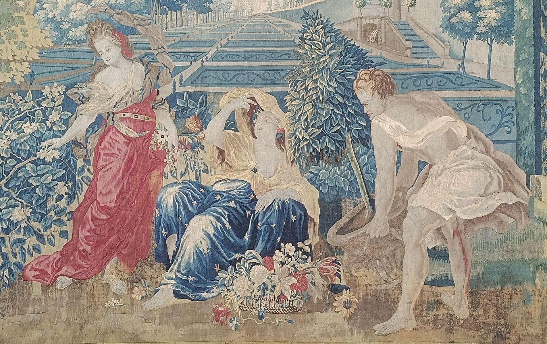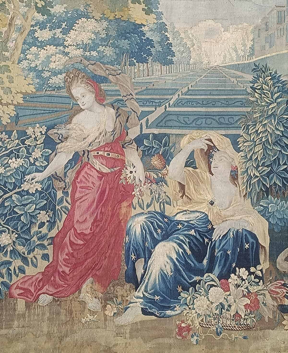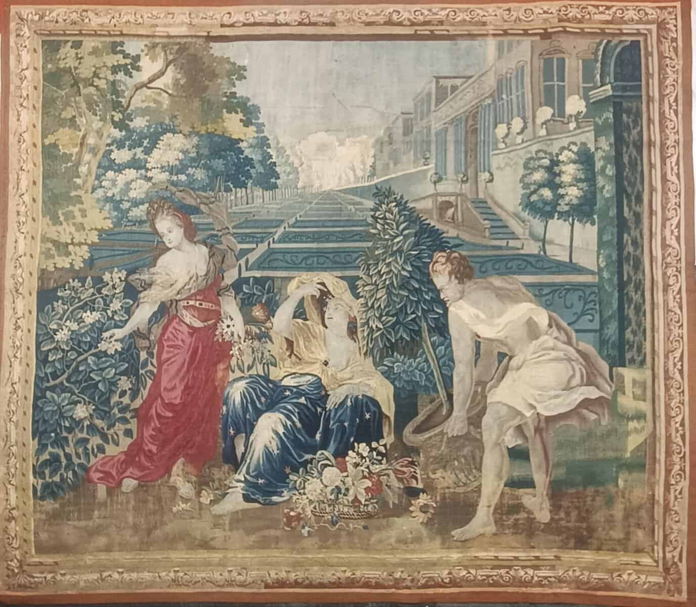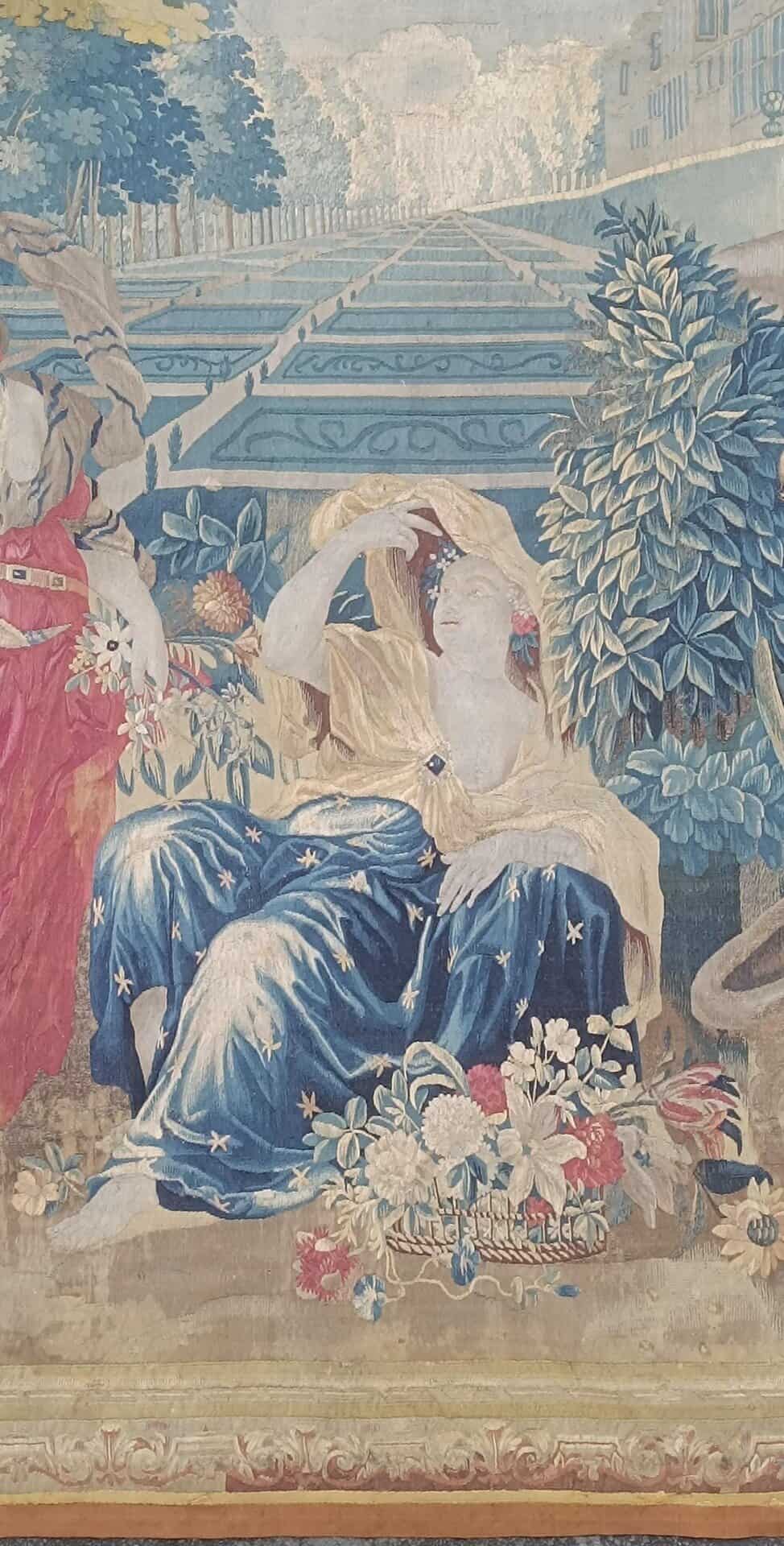 Importante tapisserie en laine et soie figurant l’allégories du jour et de la nuit avec deux vestales l’une cueillant les fleurs de l’aurore et l’autre laissant échapper de sa main les étoiles de la nuit, un génie jardinier apportant sur le côté un laurier dans un vase, le tout dans un riche Parc à la française, bordé d’une riche architecture symbolisant un escalier d’honneur d’un château.