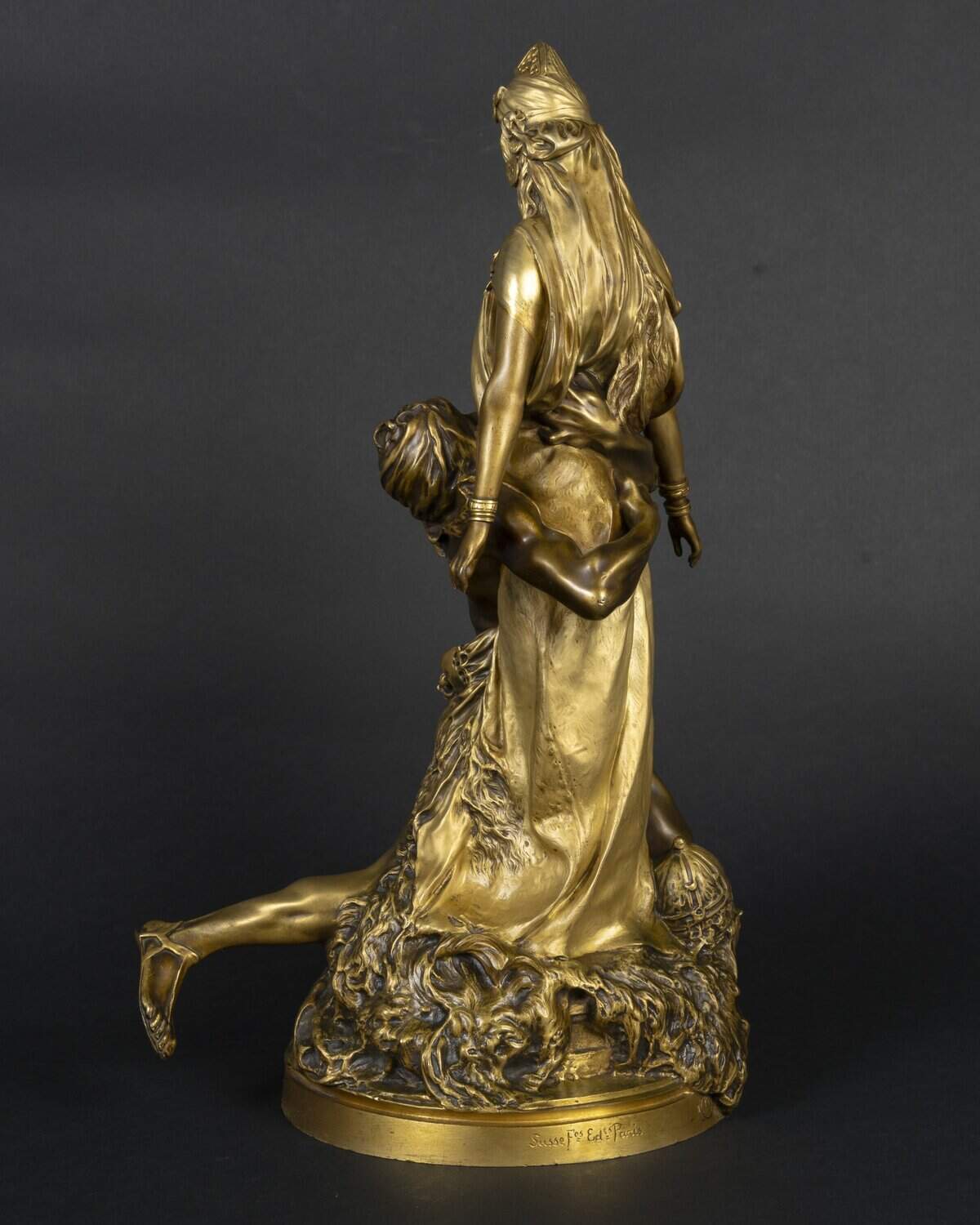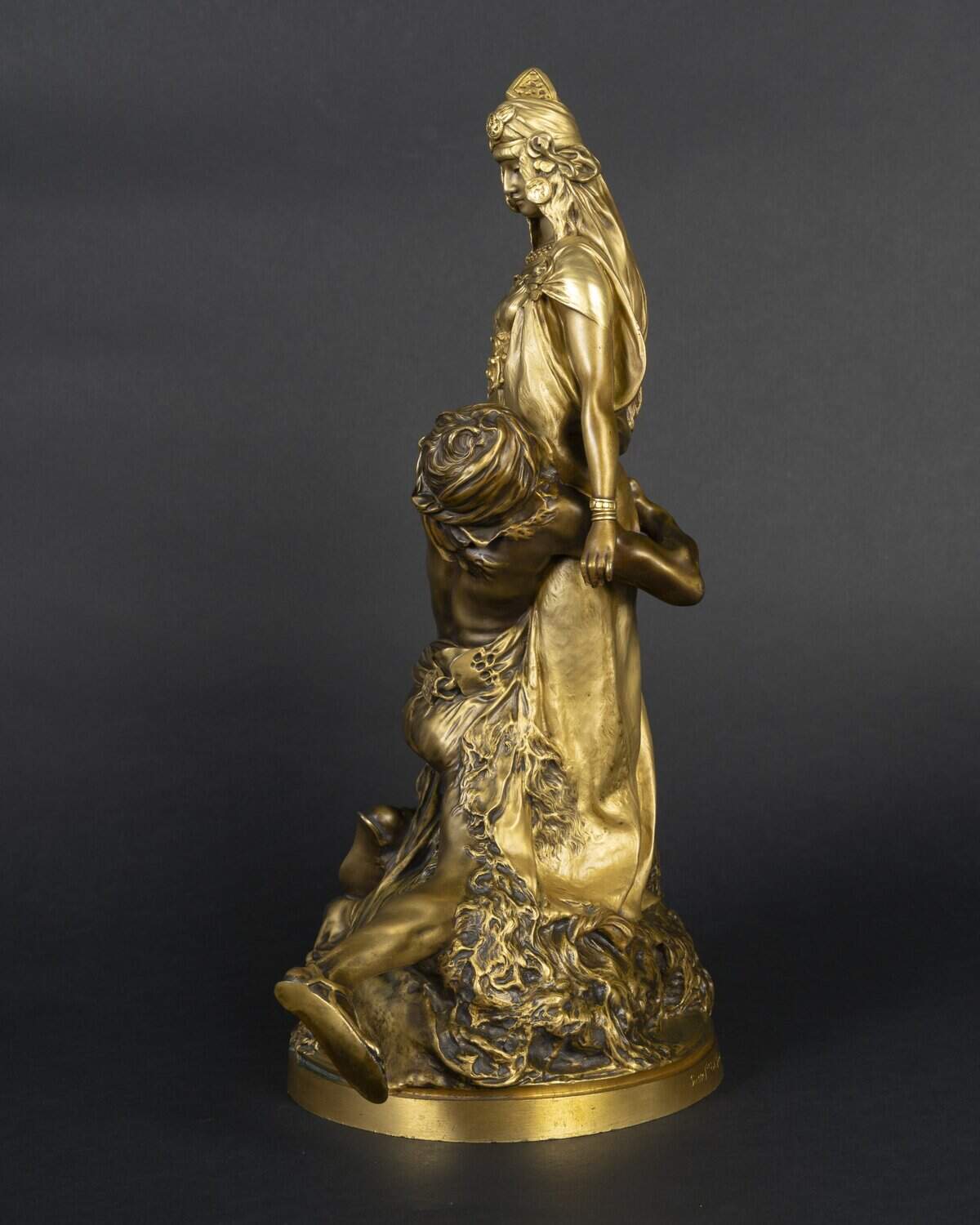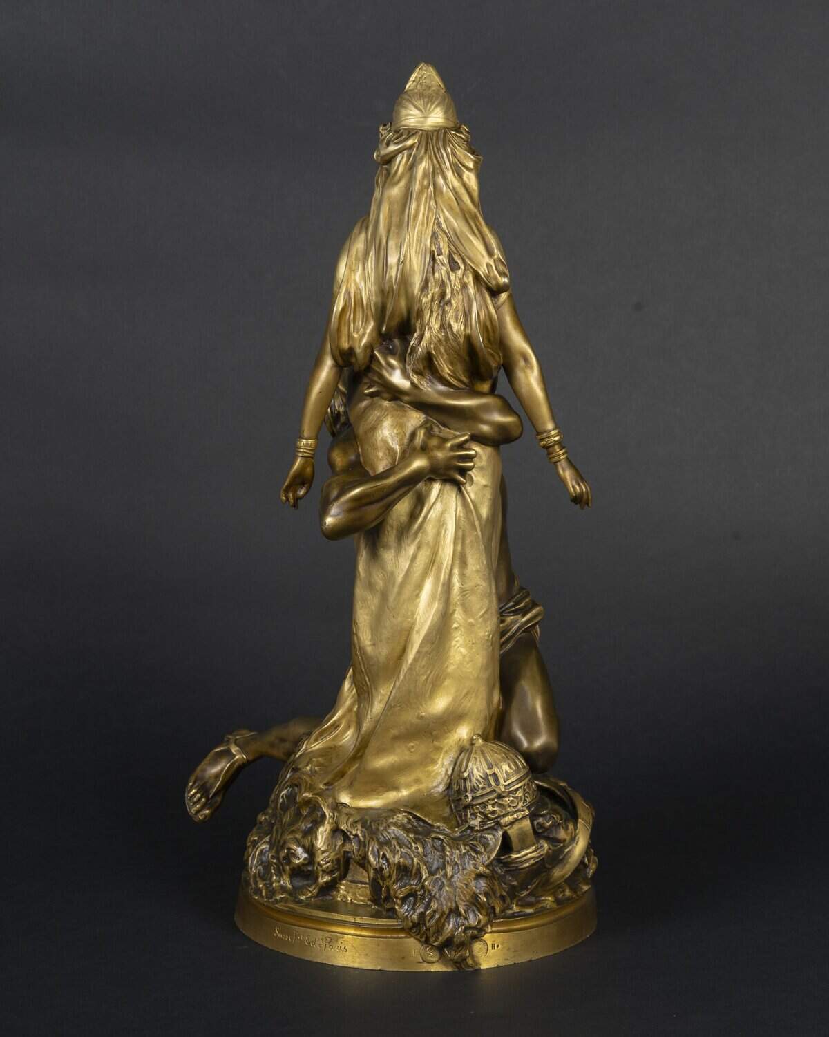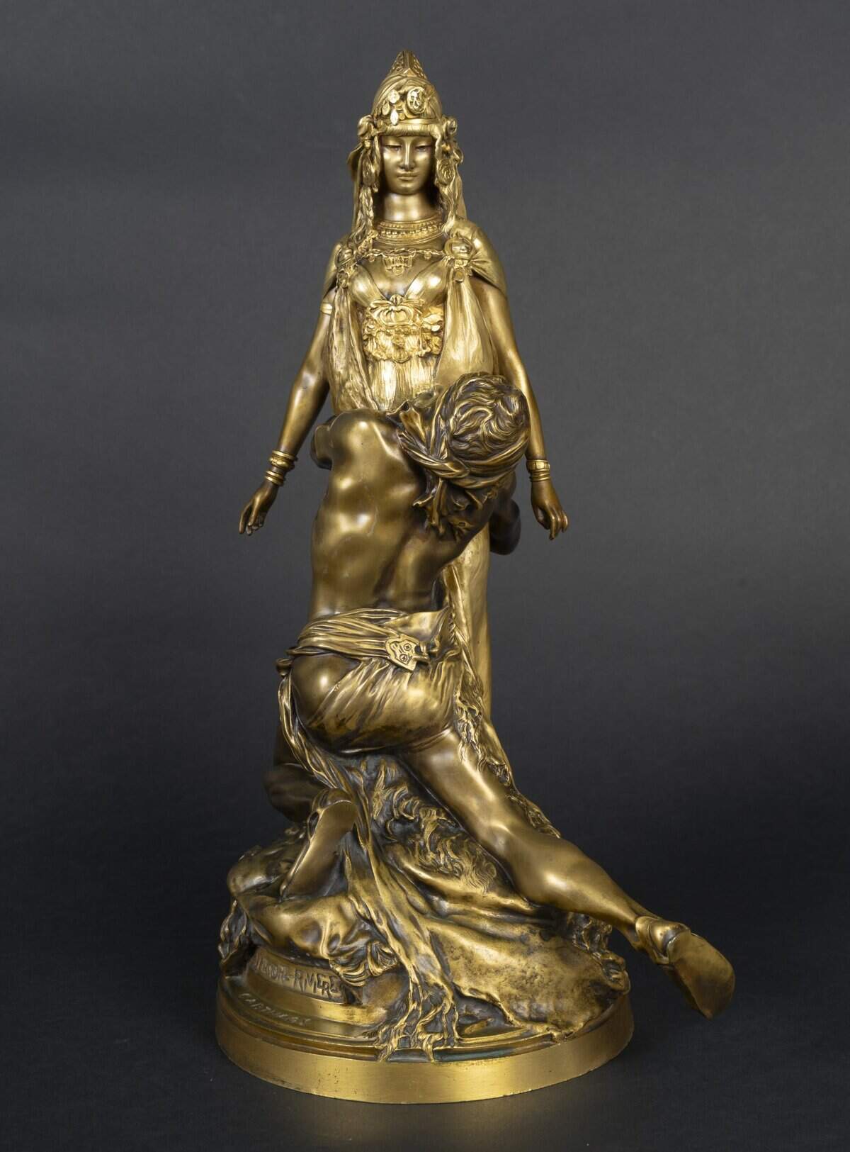 Élégante sculpture en bronze à double patine dorée représentant une scène entre une prêtresse carthaginoise et un homme agenouillé à ses pieds. La figure féminine, droite et solennelle, contraste avec le mouvement expressif du personnage masculin, créant une tension visuelle forte. La patine dorée, riche en nuances, met en valeur la finesse du modelé, les détails du costume et la qualité des drapés. Œuvre emblématique de l’esthétique orientaliste de la fin du dix-neuvième siècle.