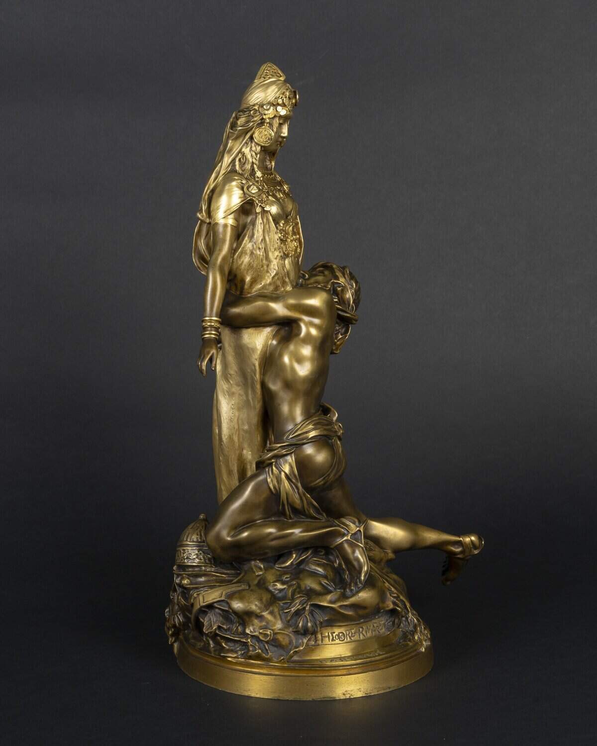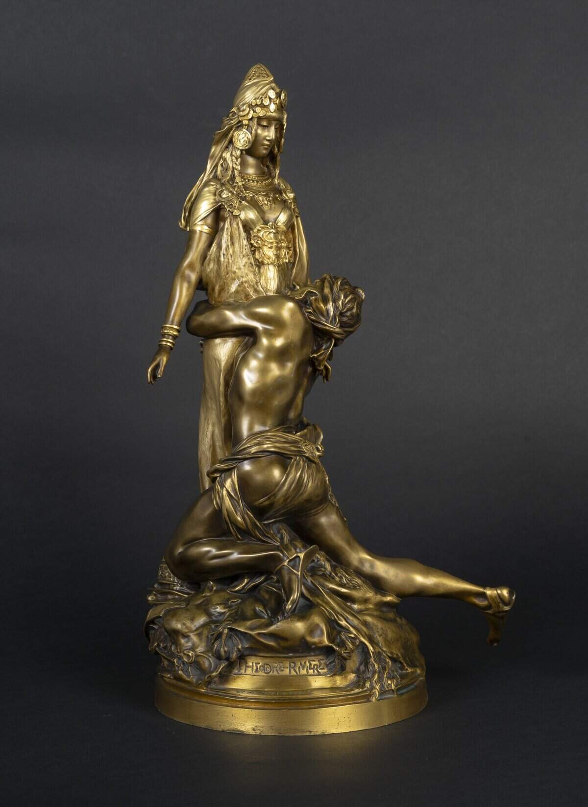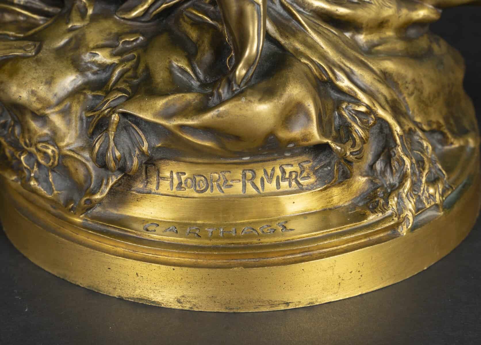 Théodore Rivière naît à Toulouse en 1857 et devient l’un des sculpteurs français les plus sensibles et originaux de la fin du dix-neuvième siècle. Formé à l’École des Beaux-Arts, il se tourne très tôt vers une sculpture narrative, expressive et fortement influencée par l’exotisme, les civilisations anciennes et les récits historiques. Sa carrière se développe à Paris, où il expose régulièrement au Salon et où il est remarqué pour la finesse de son modelé et la charge dramatique de ses compositions.