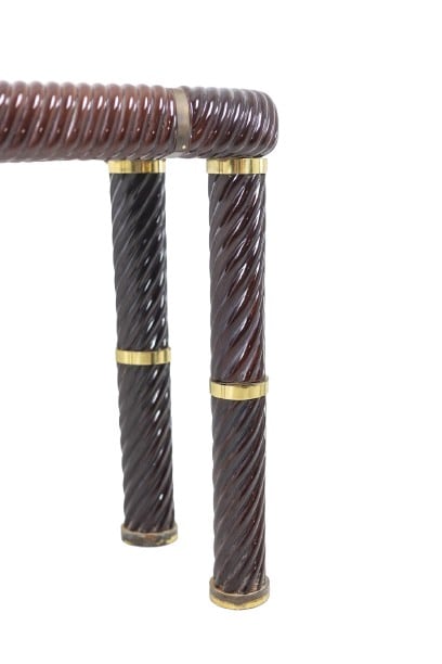 Console rectangulaire en céramique de couleur bordeaux à décor de cordage et laiton doré. Plateau en miroir fumé cerclé de laiton doré.