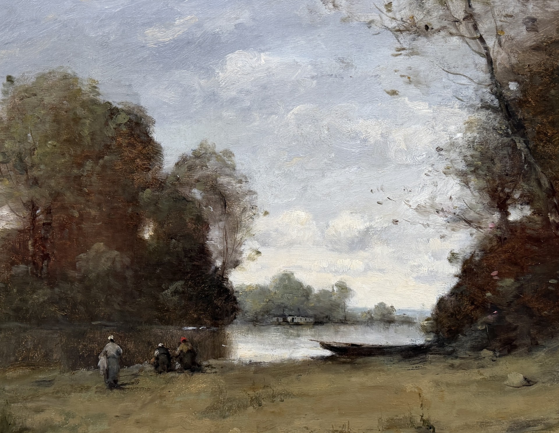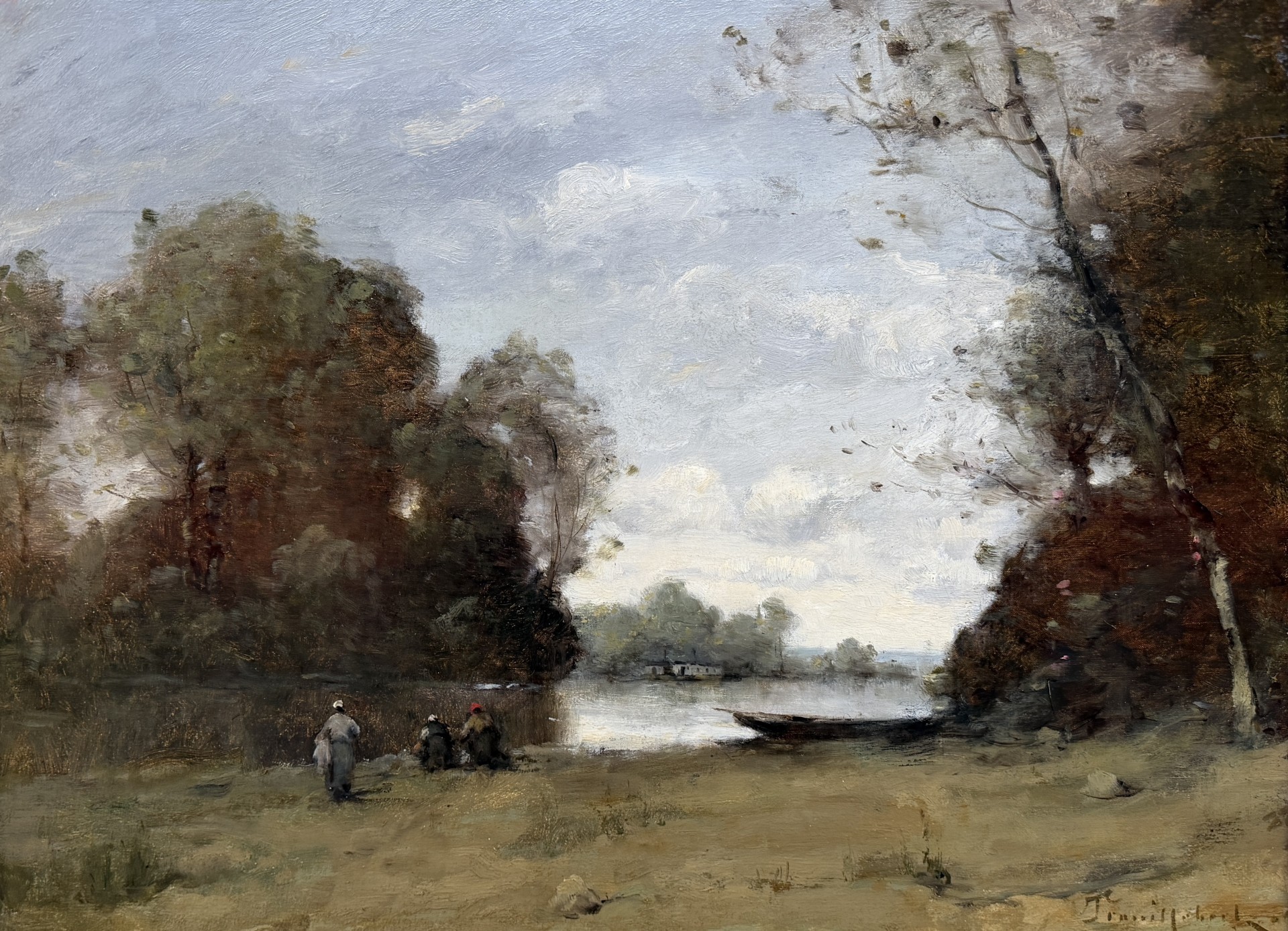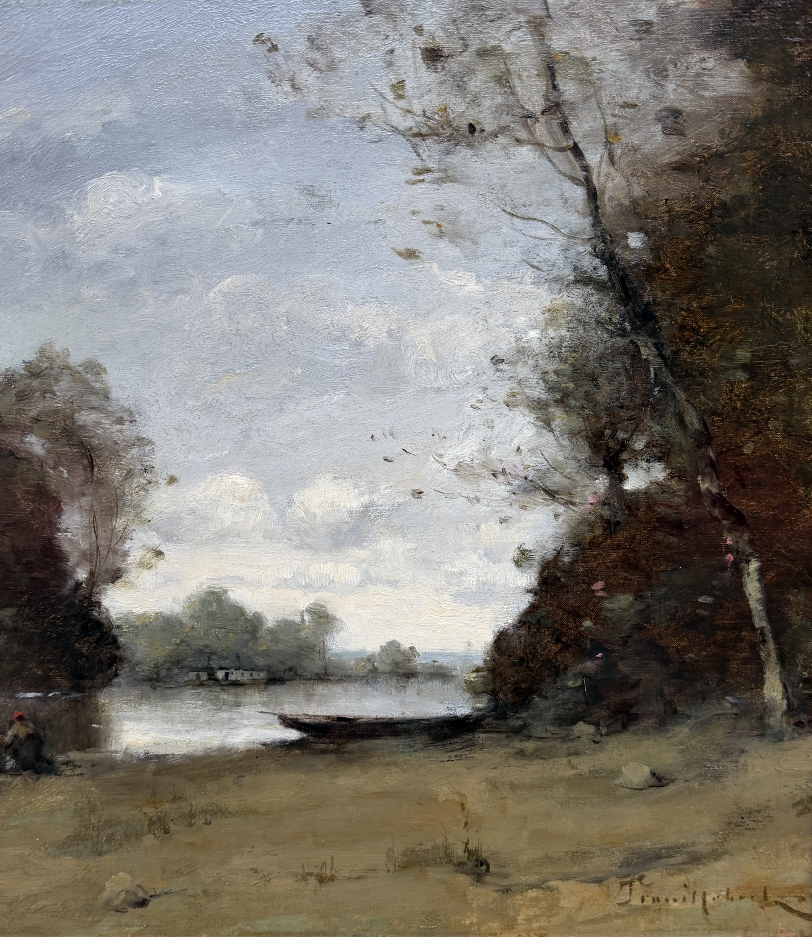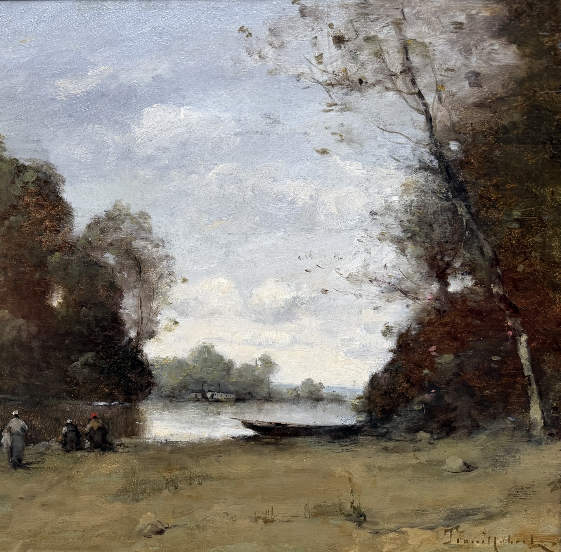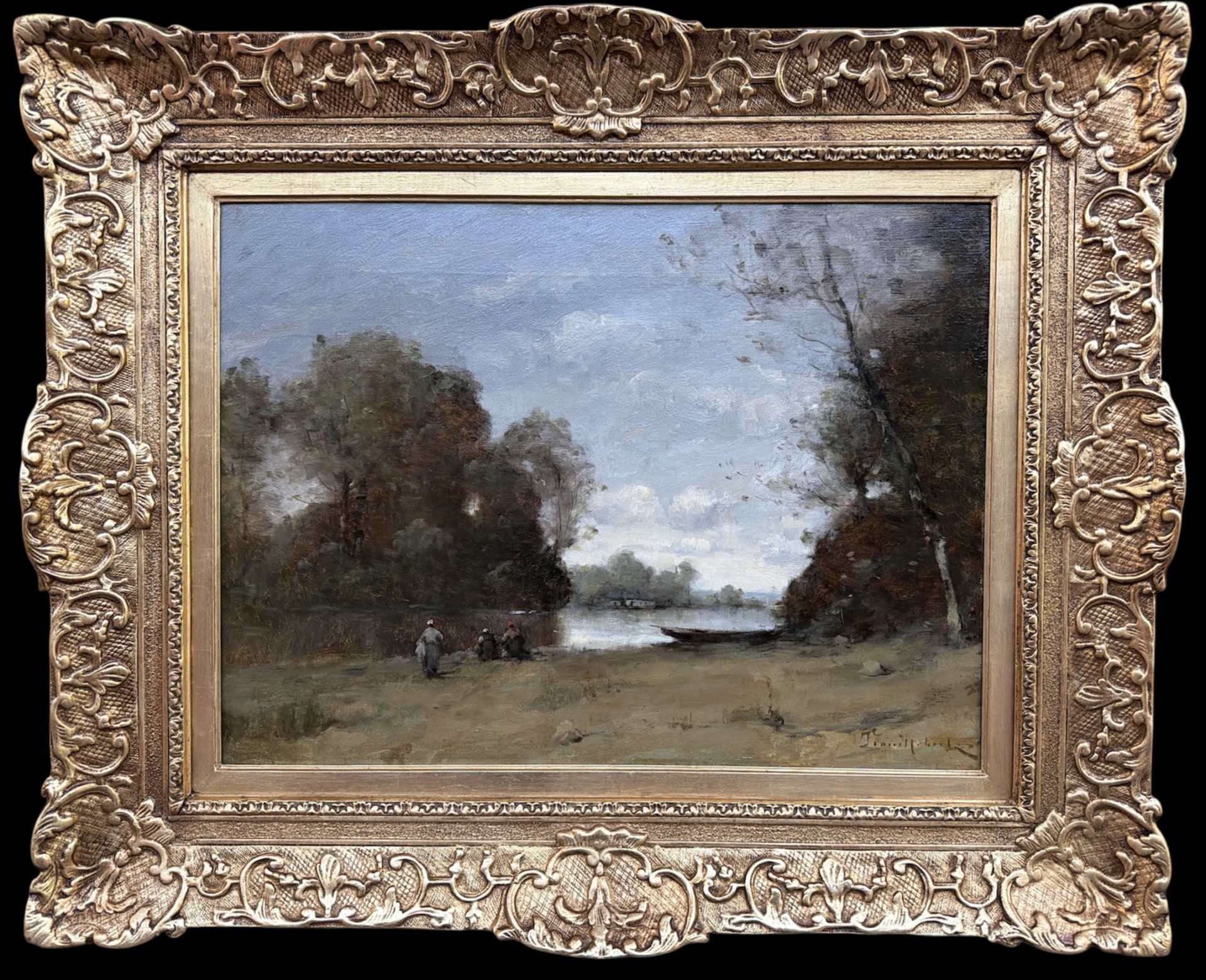 TROUILLEBERT Paul Désiré Né à Paris en 1829 / Mort en 1900 à Paris –Peintre de genre, figures, nus, portraits, paysages –Elève de Hebert et Jallabert, Paul Désiré TROUILLEBERT débute honorablement une carrière de portraitiste, mais sa rencontre avec Corot le convertit si bien au paysage sur nature qu’il ne vit plus désormais que dans l’orbite du maître de Ville-d’Avray, orientant presque exclusivement ses recherches sur le plein air et le rendu de l’atmosphère – Avec franchise, Paul Désiré TROUILLEBERT s’inspirera toute sa vie des mêmes thèmes que Corot : les bords de l’eau au matin et au soleil couchant, les étangs dans la campagne, les arbres et les bois sont autant de sujets qui ne cessent de le séduire – D’un pinceau qui ne manque ni de légèreté, ni de transparence, Paul Désiré TROUILLEBERT s’applique à traduire, dans la gamme grise de son aîné, les valeurs lumineuses et atmosphériques de la nature – Ses peintures ont eu un vif succès auprès du public et conserve un attrait constant -Paul Désiré TROUILLEBERT expose au Salon à partir de 1865