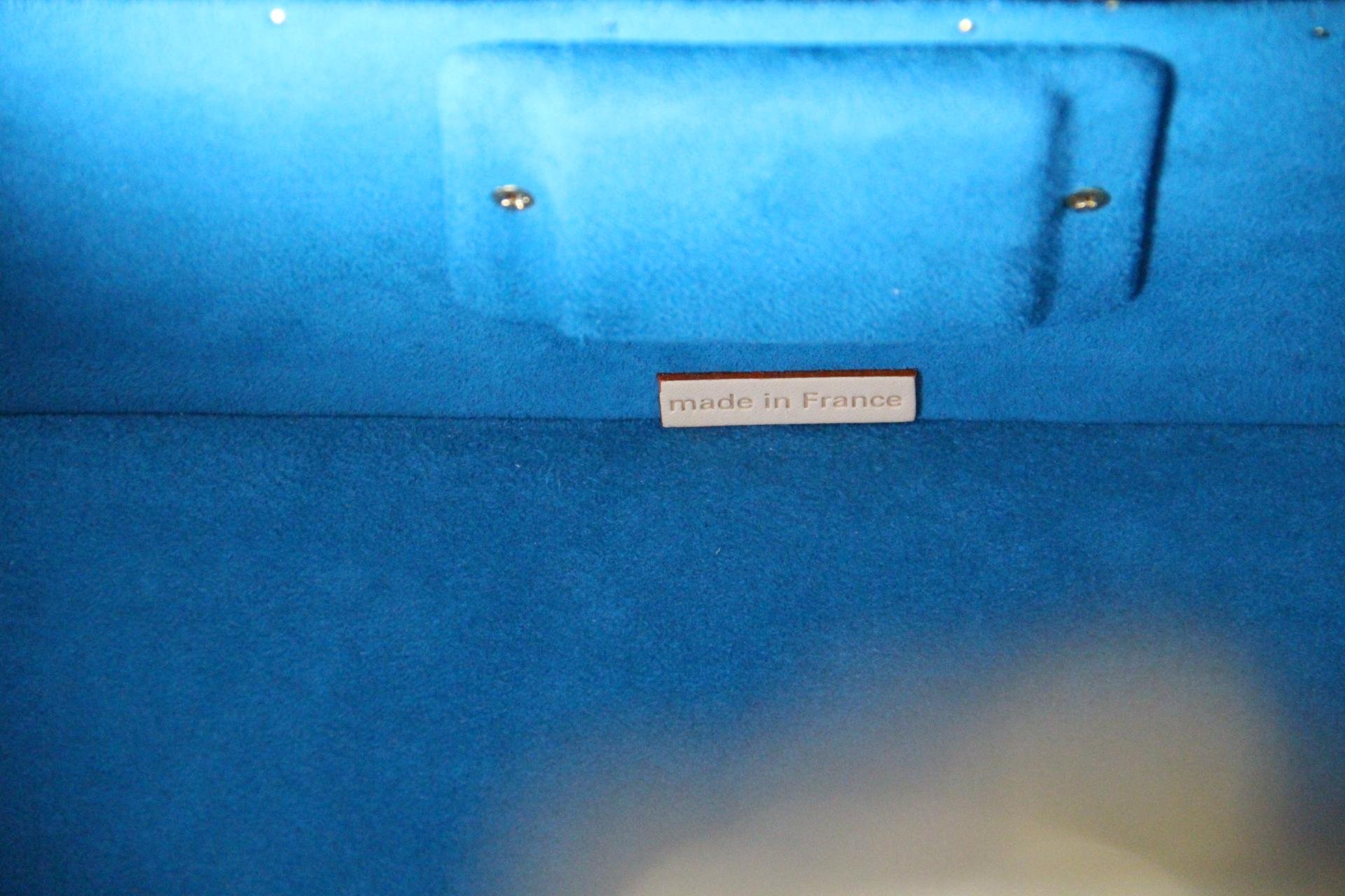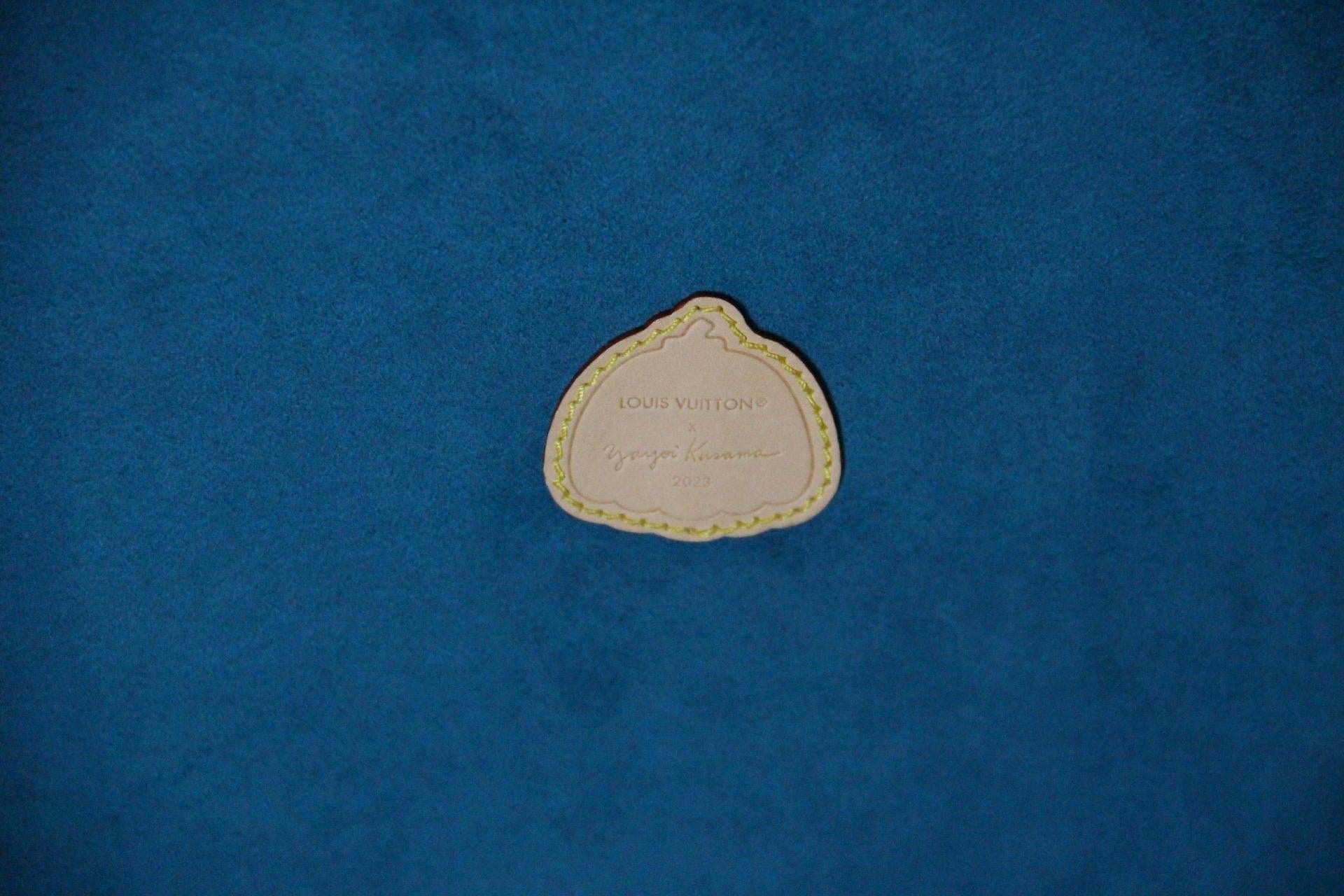 Quant à l’intérieur, il est tapissé d’une microfibre bleu vif, propre et parfaitement conservée, offrant de nombreux rangements et une grande polyvalence. Il a également conservé son label en cuir embossé en forme de citrouille, écrit Louis Vuitton Yayoi Kusuma 2023 ainsi que son numéro de série.