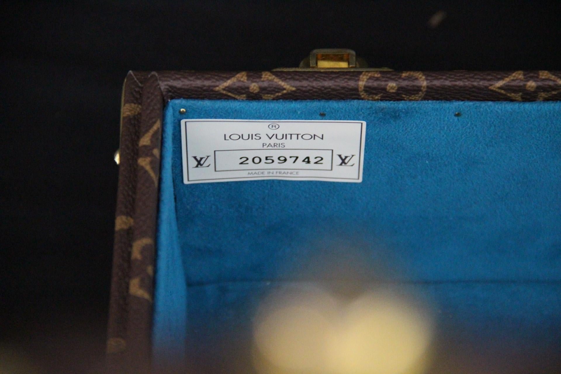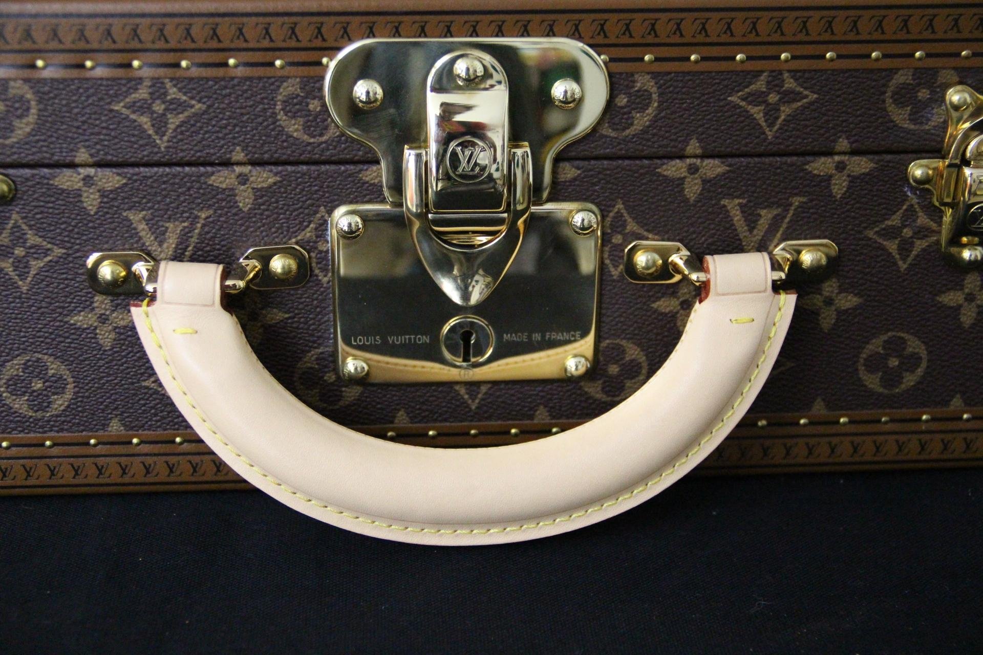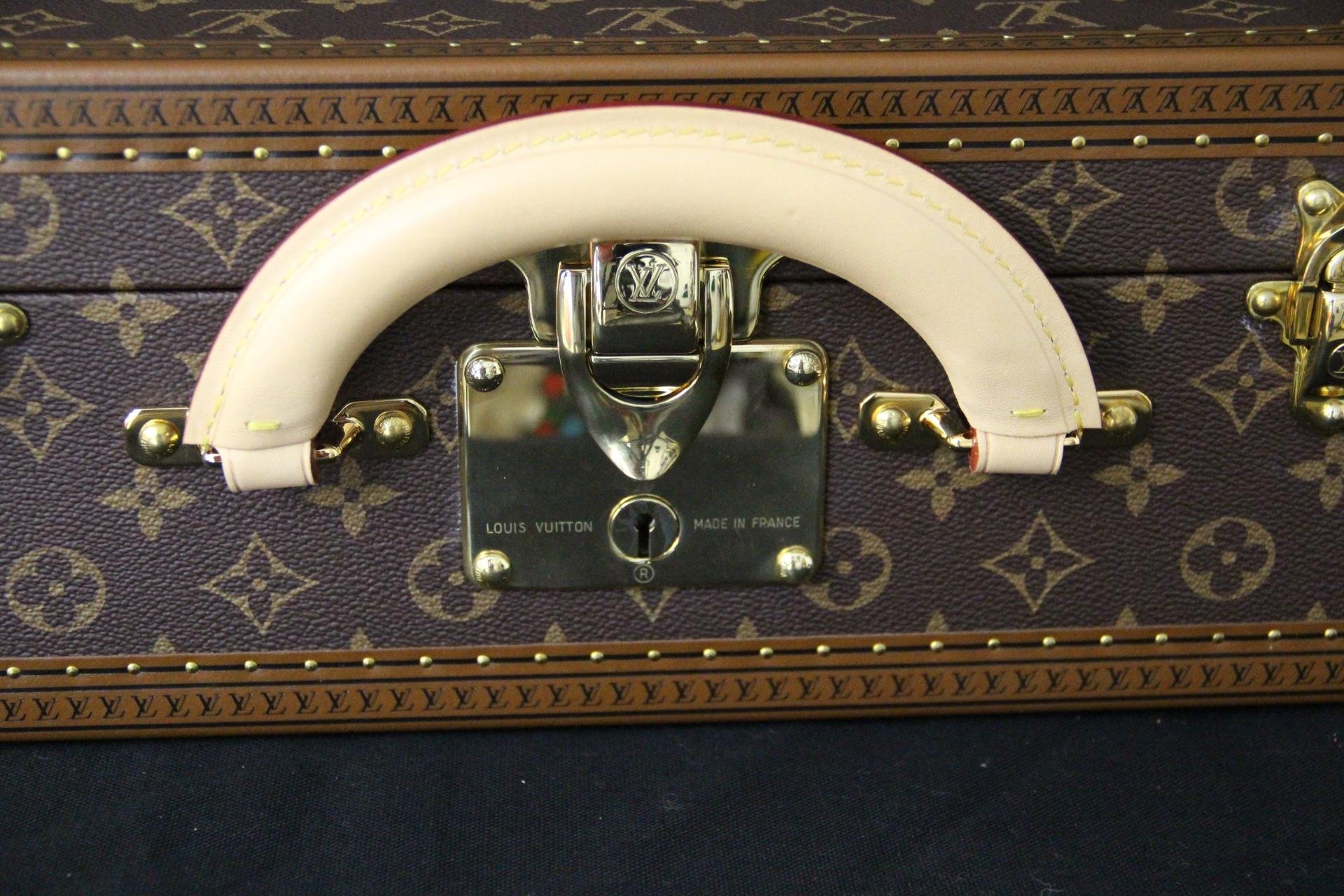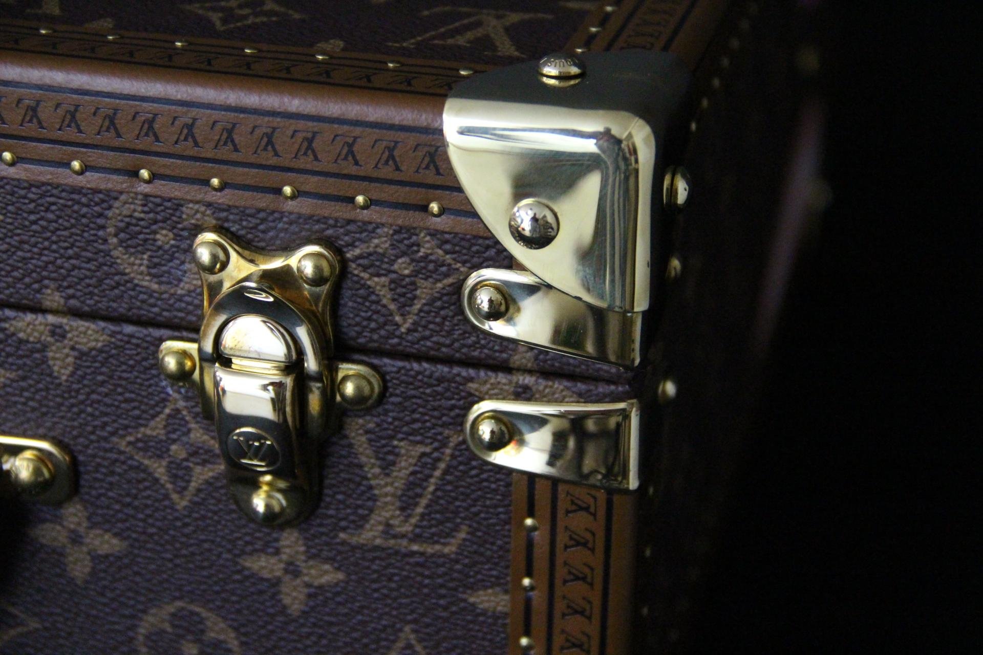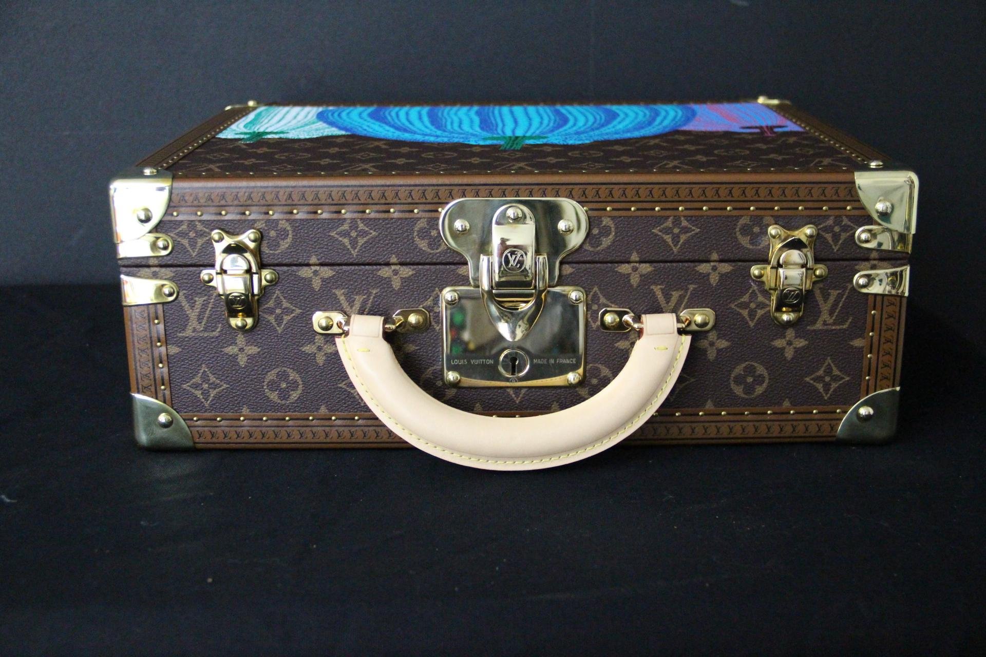 L’œuvre d’art raffinée crée un contraste visuel saisissant avec le fond traditionnel du monogramme, transformant cette valise de luxe en une pièce de design sculpturale. Il comprend tous les accessoires en laiton massif estampillés Louis Vuitton : serrures, fermoirs et clous, ainsi que la garniture estampillée LV partout. Il est doté d’une poignée en cuir large et confortable. Cette malle illustre le savoir-faire exceptionnel de Louis Vuitton et son héritage en matière de construction.