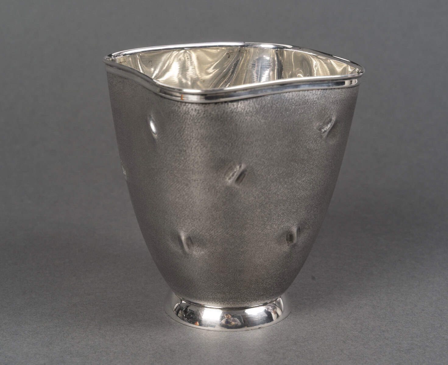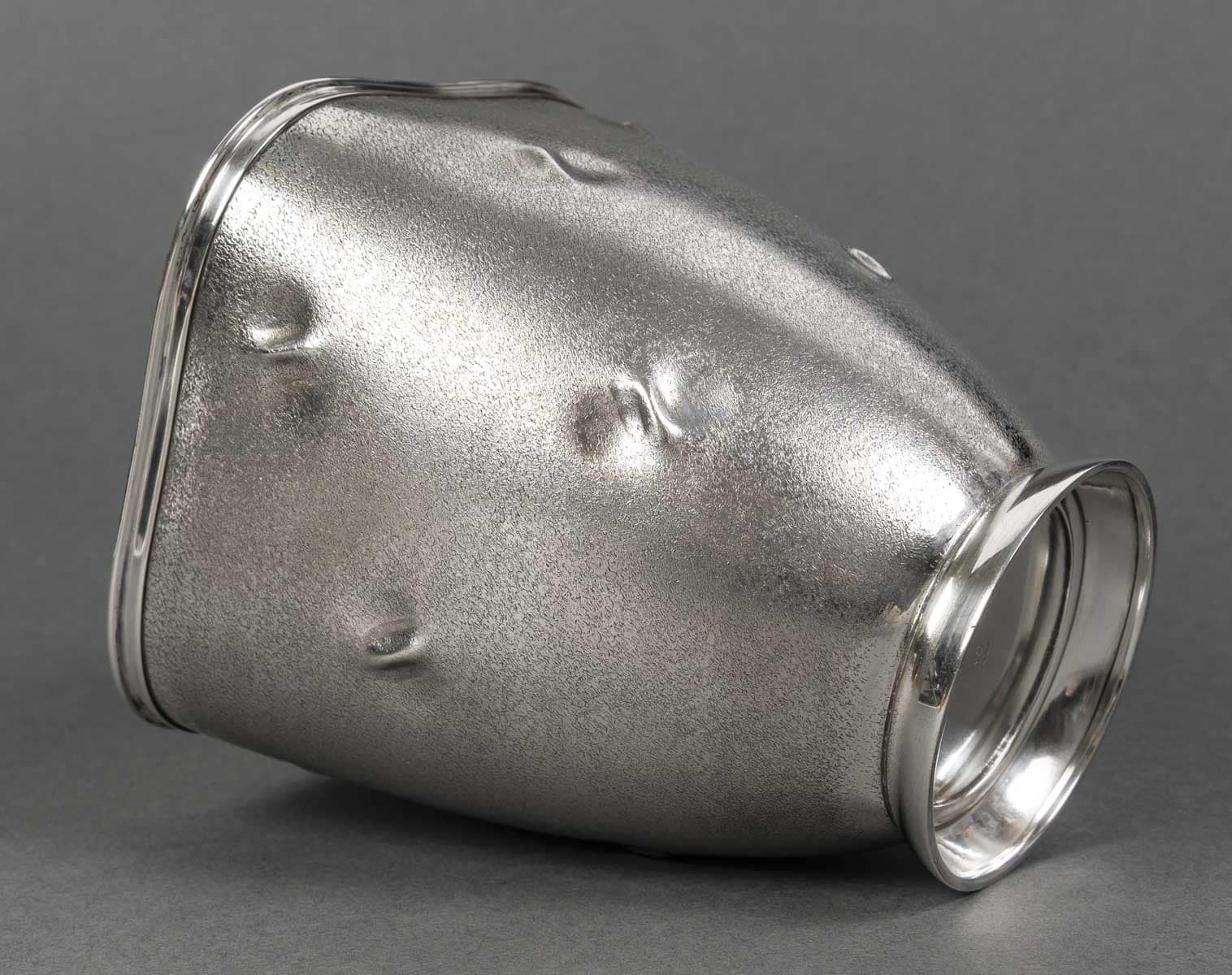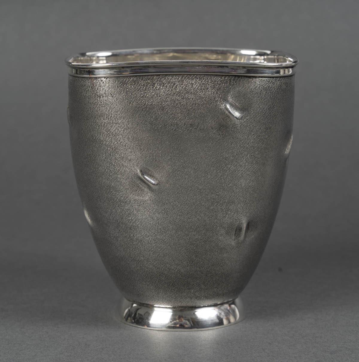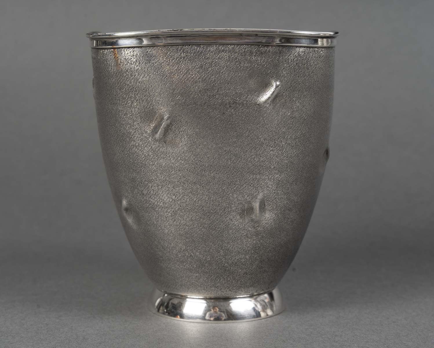 Vase en argent massif présente une silhouette sobre, légèrement galbée, reposant sur un piédouche circulaire poli qui dialogue avec le bord supérieur, également poli et brillant. La surface du corps contraste par son traitement particulier : une granulation mate, ponctuée de petites empreintes en creux irrégulières, qui animent la matière d’effets de lumière et d’ombres. Ce décor, à la fois discret et raffiné, confère à l’objet un caractère organique et contemporain, rappelant des textures naturelles ou minérales.