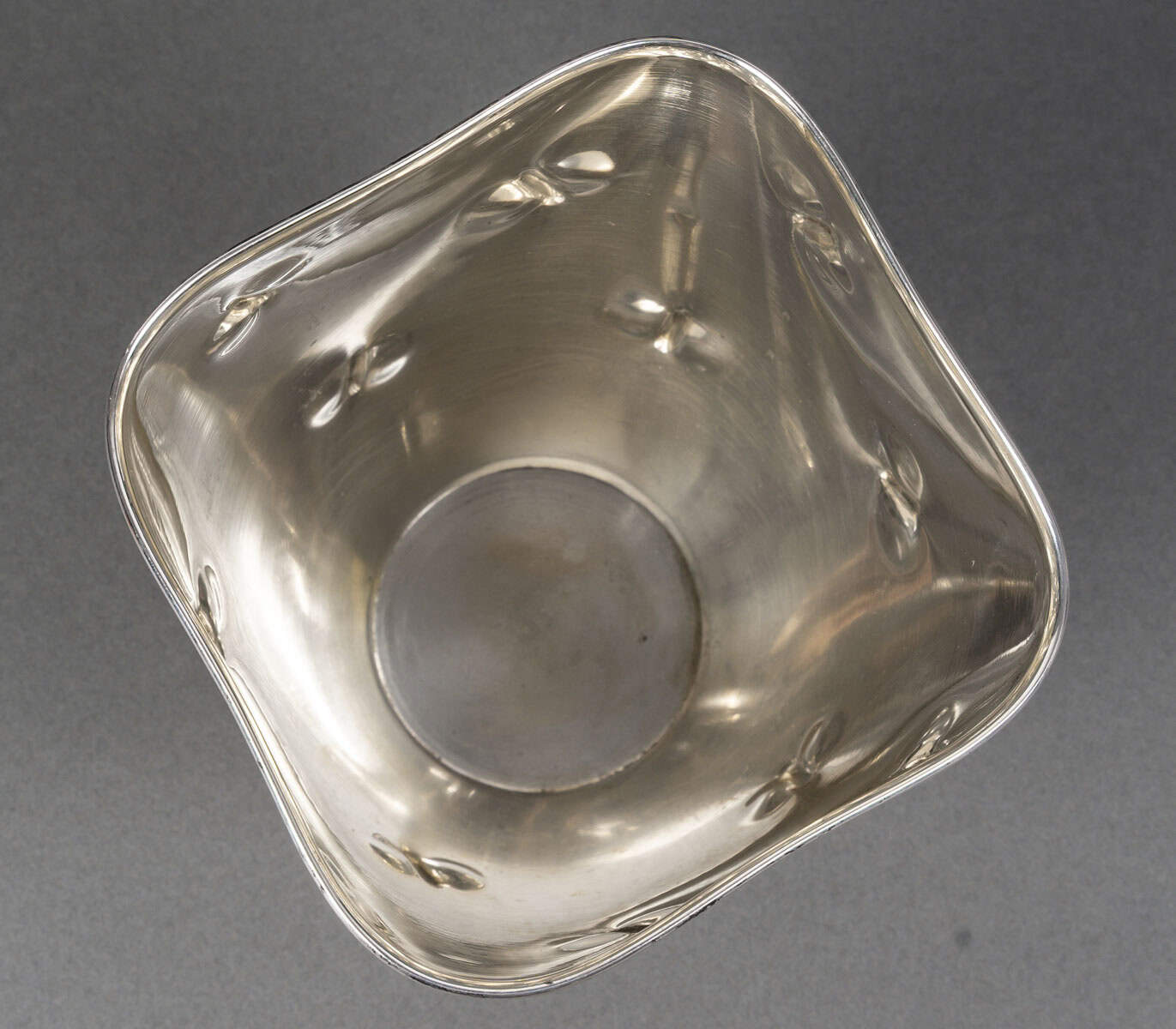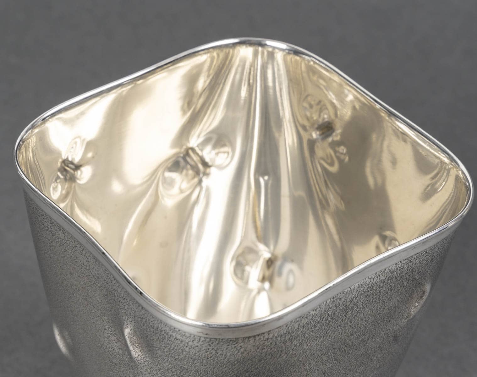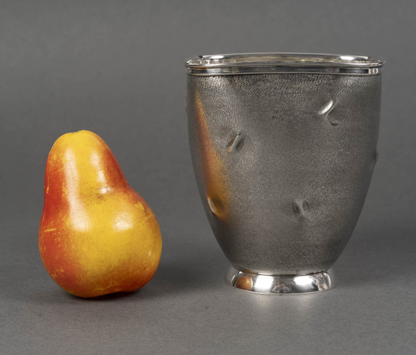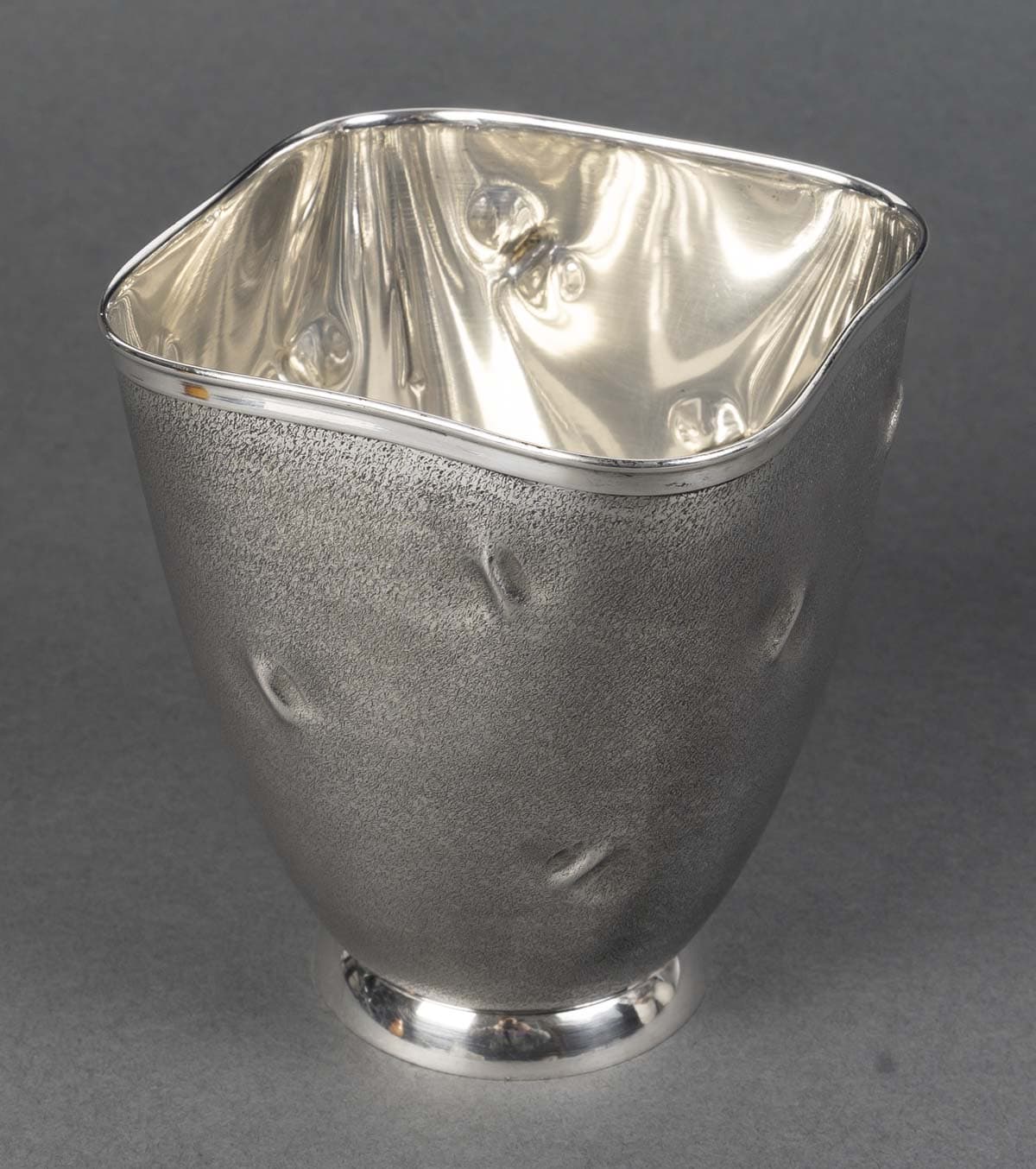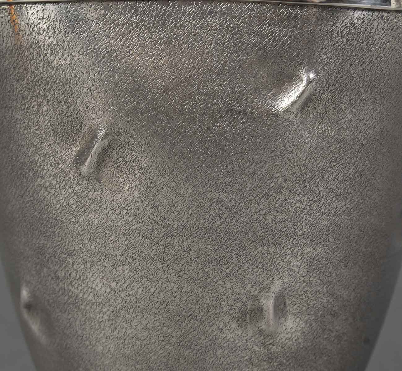 Vase en argent massif présente une silhouette sobre, légèrement galbée, reposant sur un piédouche circulaire poli qui dialogue avec le bord supérieur, également poli et brillant. La surface du corps contraste par son traitement particulier : une granulation mate, ponctuée de petites empreintes en creux irrégulières, qui animent la matière d’effets de lumière et d’ombres. Ce décor, à la fois discret et raffiné, confère à l’objet un caractère organique et contemporain, rappelant des textures naturelles ou minérales.