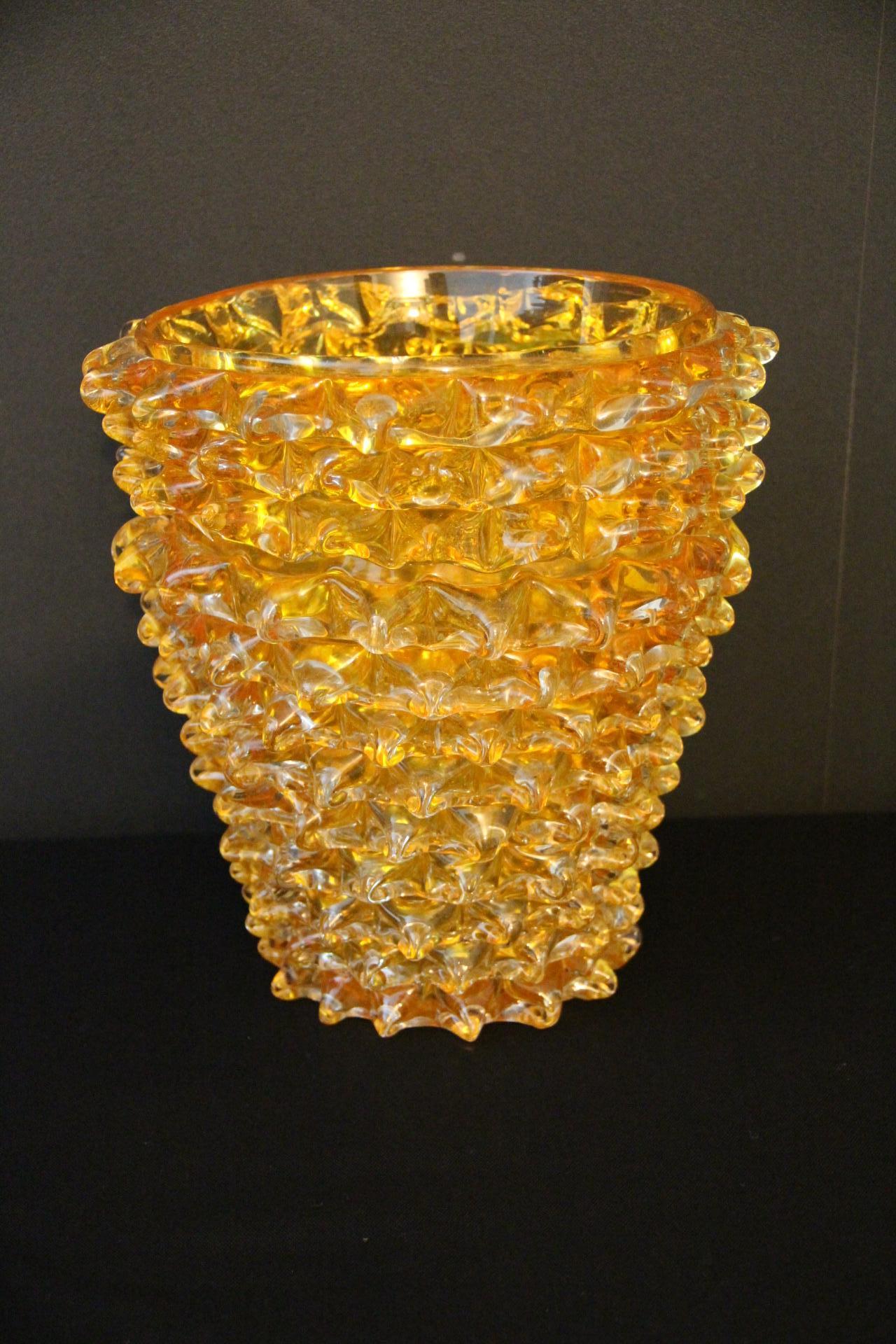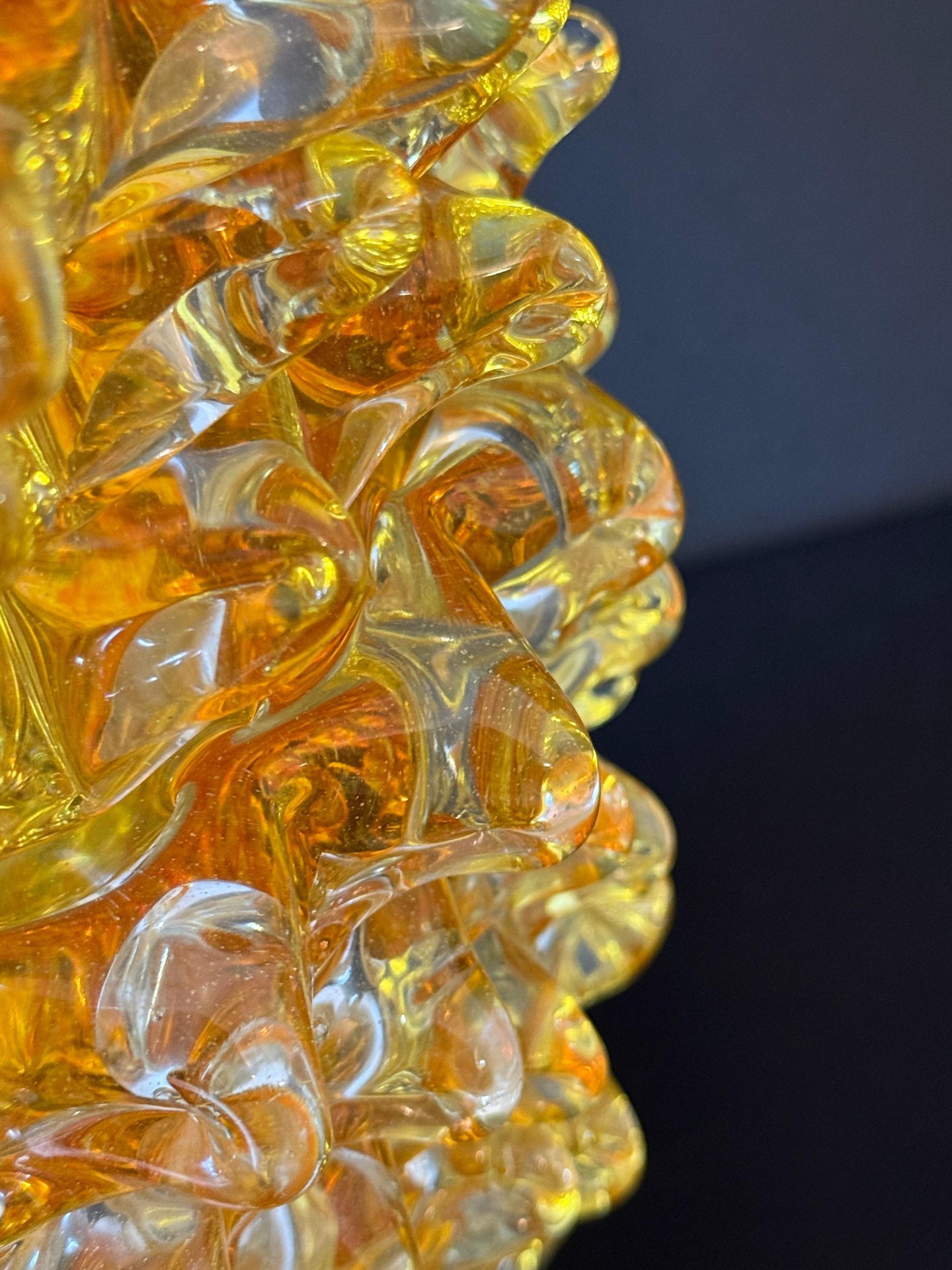 Ce vase en verre de Murano est très impressionnant et sa couleur est très vive. Sa couleur est très inhabituelle puisqu’elle est orange abricot foncé. Il est entièrement décoré à la main selon la technique du rostrato : des pointes de verre ont été tirées individuellement en relief pour obtenir cet effet spectaculaire en 3 D. Cette technique est typiquement vénitienne et nécessite des artisans très qualifiés. En effet, les artisans doivent être très rapides afin d’étirer toutes les pointes lorsque la température est suffisamment élevée. Sa finition texturée et sculpturale joue avec les lumières et les reflets. Son verre à parois épaisses produit de nombreux reflets irisés. De plus, les photos ne lui rendent pas justice car il est bien plus beau en vrai que sur les photos. Sa forme et sa couleur magnifique en feront l’objet d’attentionparfait dans tous les beaux intérieurs et s’accorderont avec les intérieurs contemporains, modernes, du milieu du siècle ou art déco.