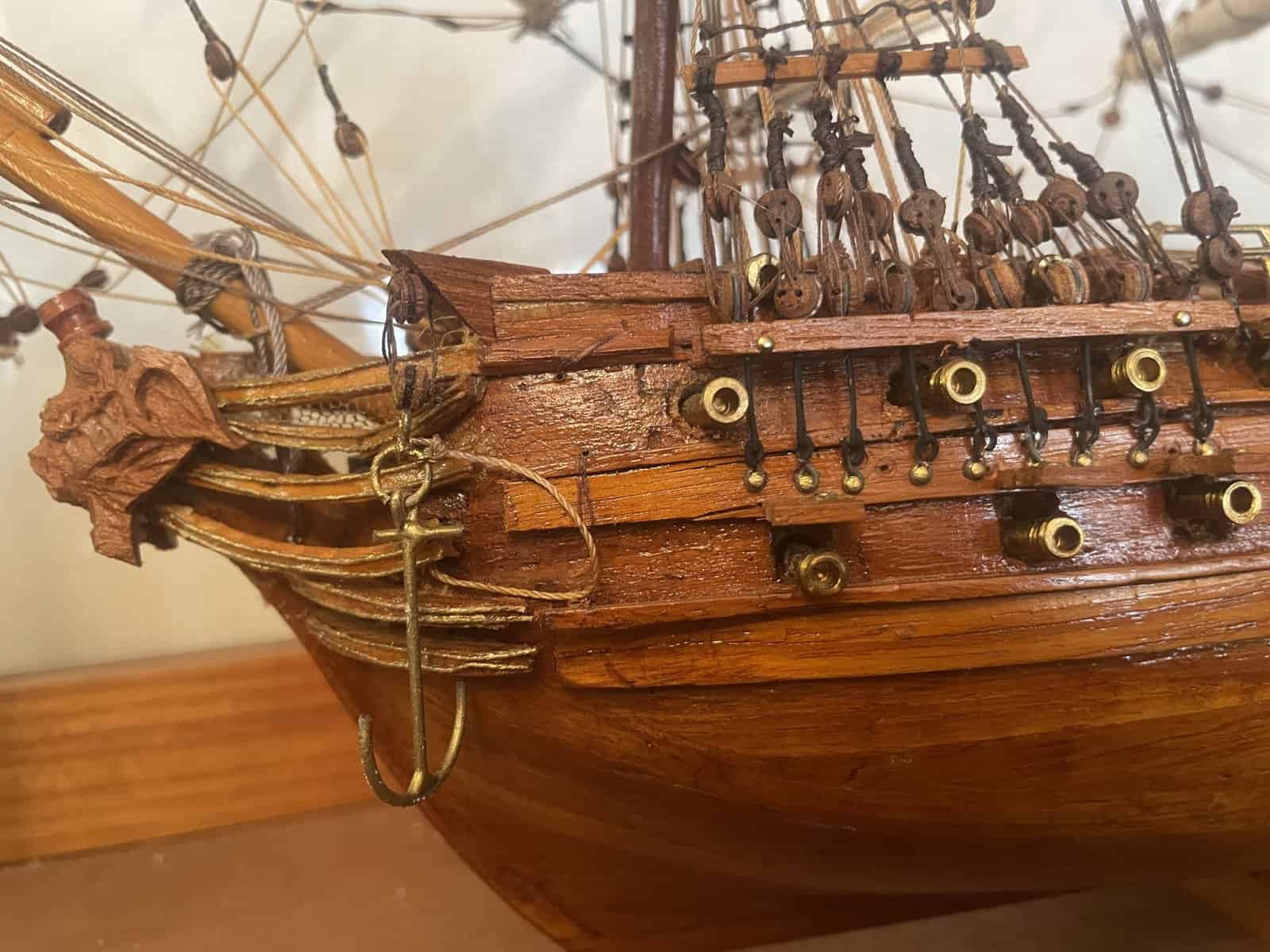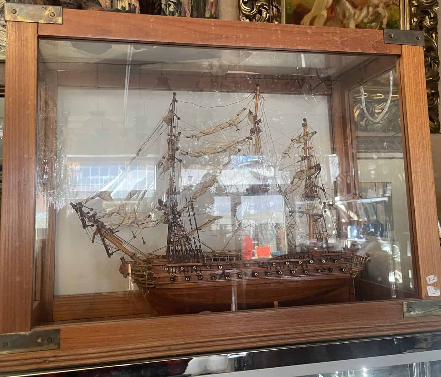 Voilier trois mâts en bois dans sa vitrine .