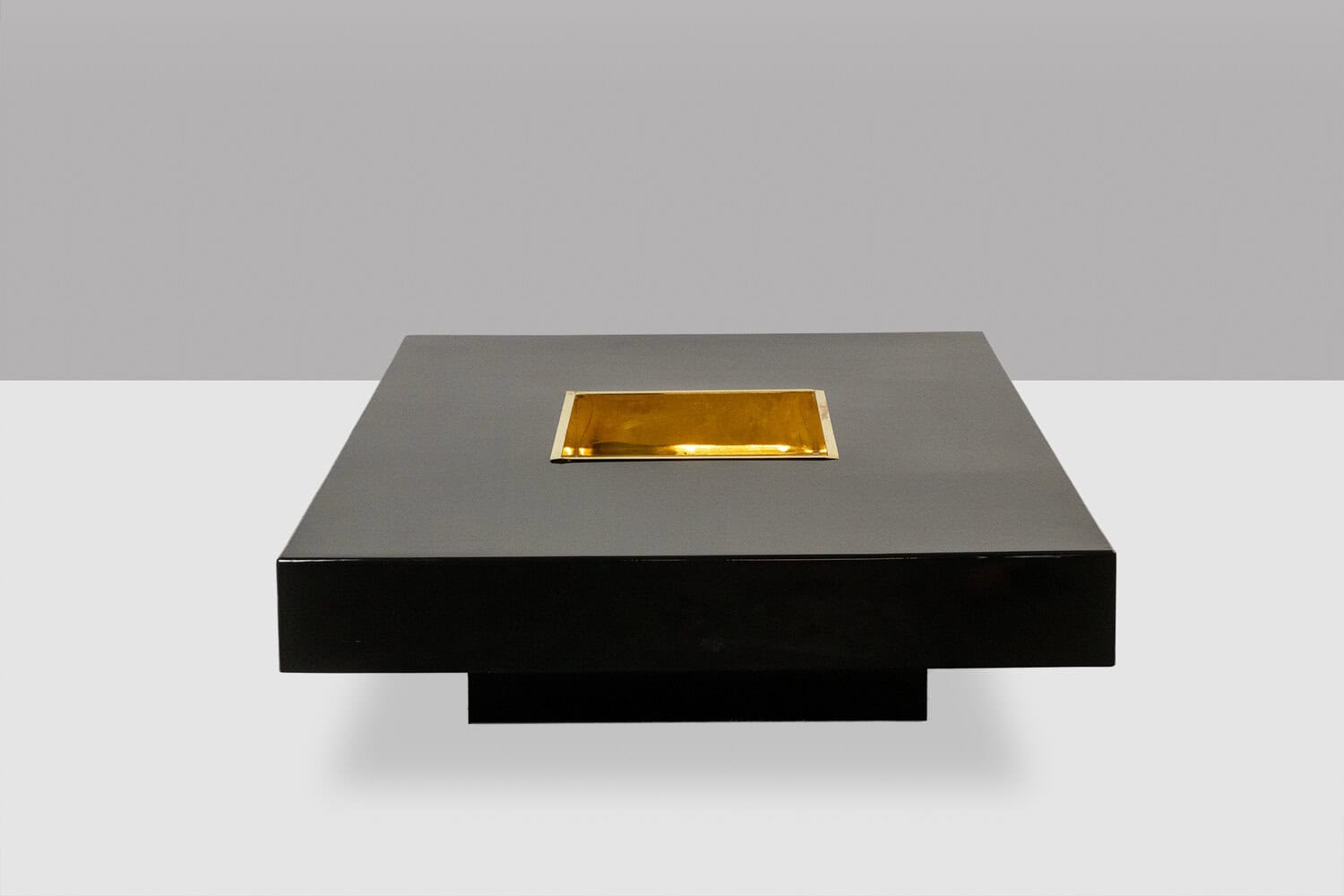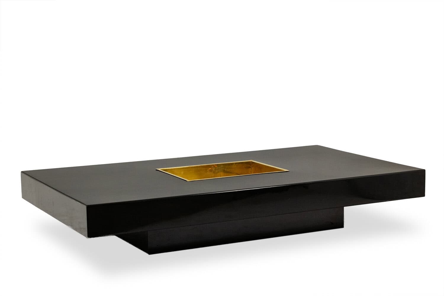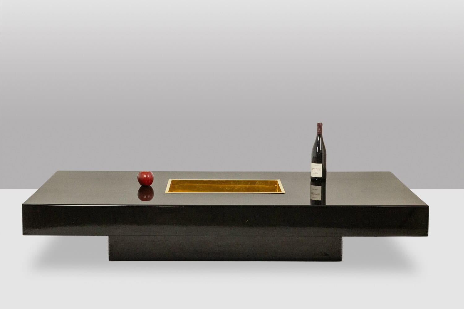 Grande table basse rectangulaire en bois laqué noir avec son casier central en laiton doré intégré au plateau.