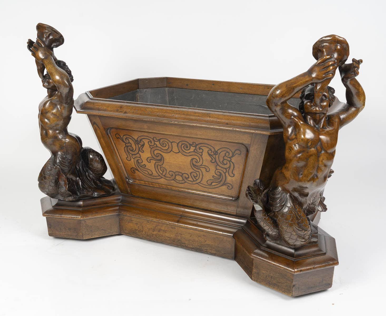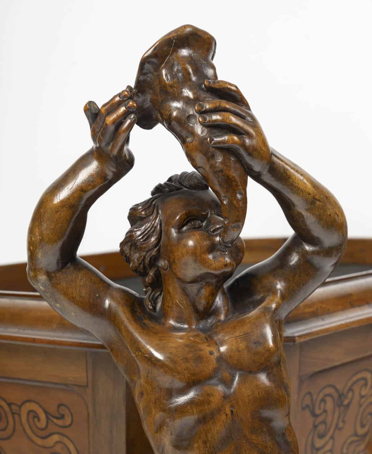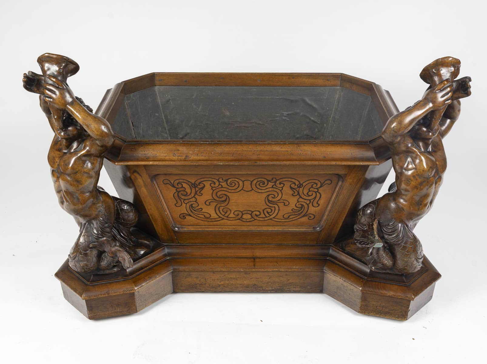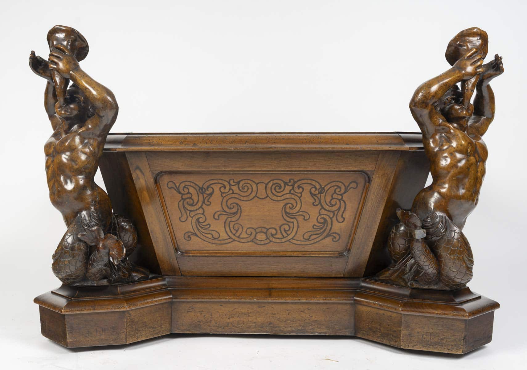Garni de deux tritons sculptés en façade. La vasque est marquetée de rinceaux sur chaque face et protégée par une couverture en étain.