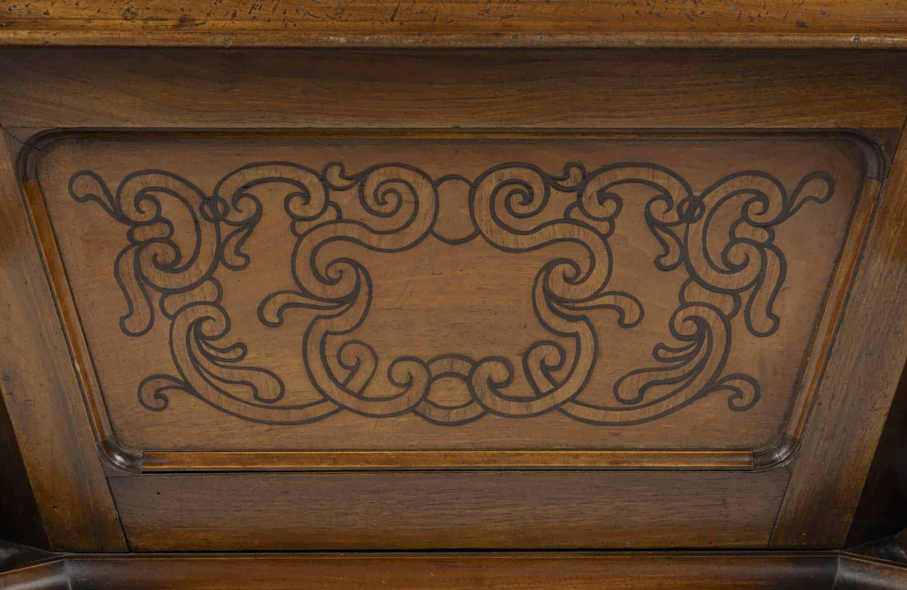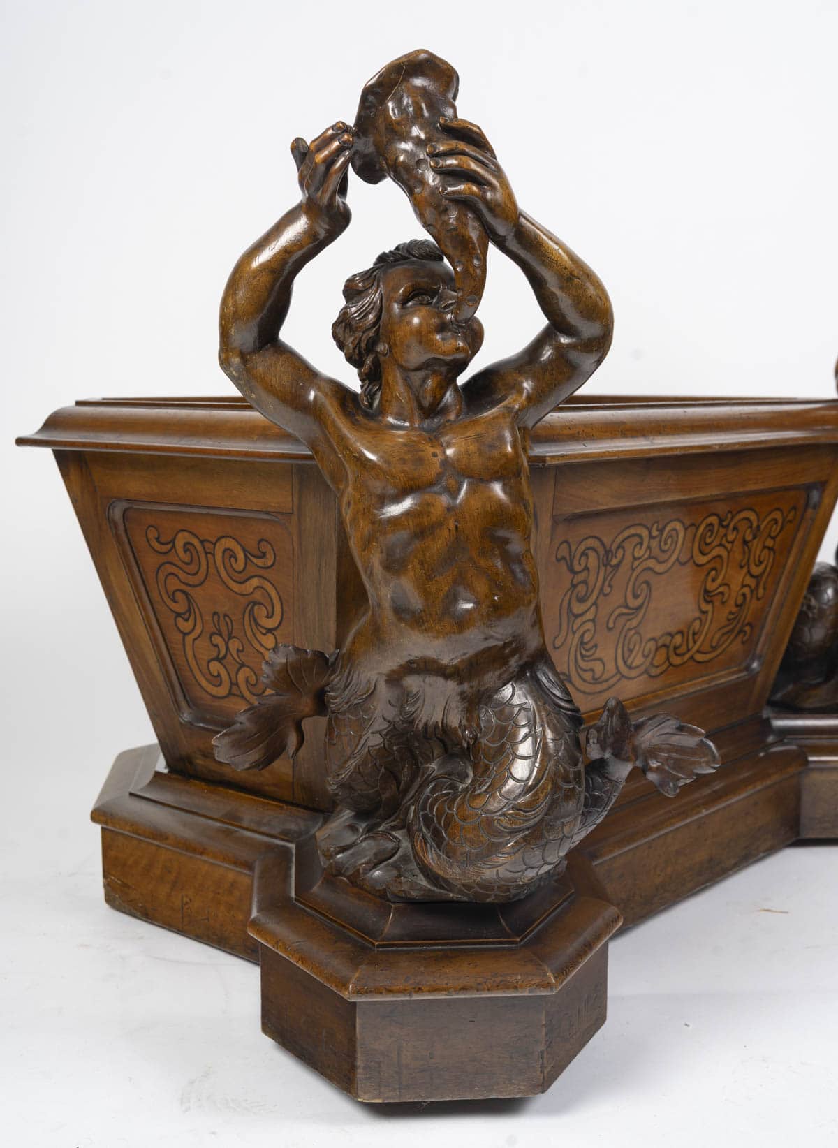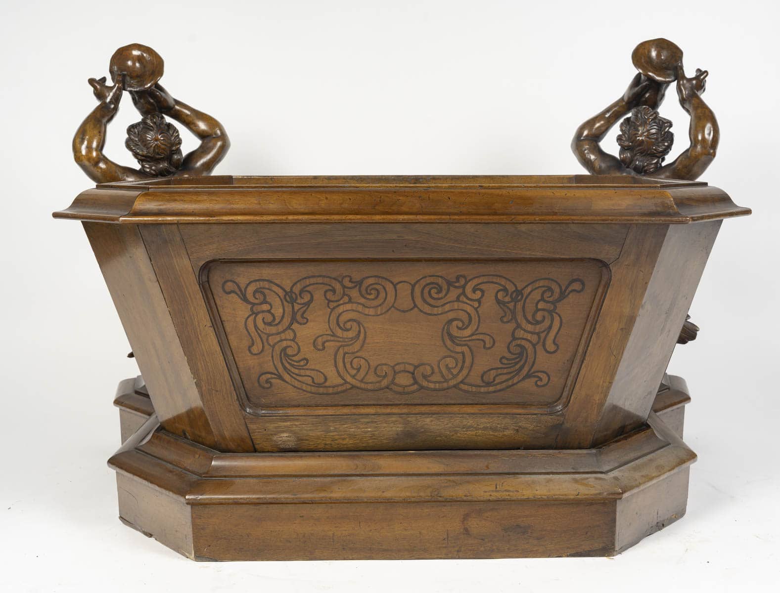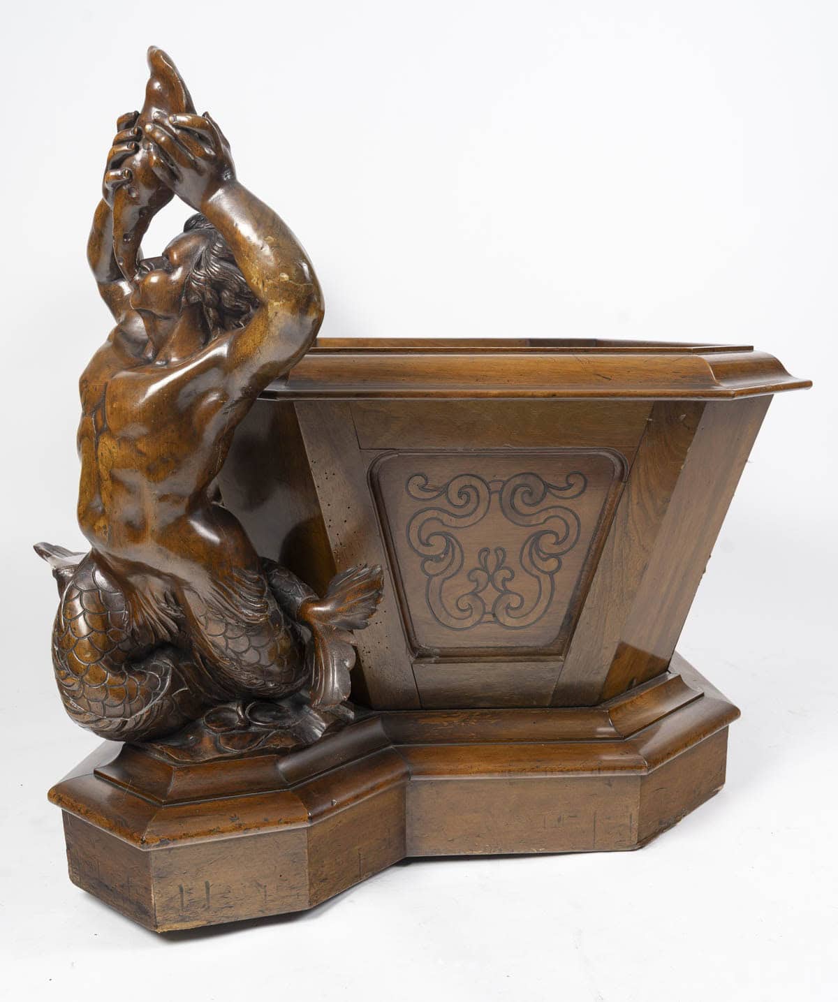 Garni de deux tritons sculptés en façade. La vasque est marquetée de rinceaux sur chaque face et protégée par une couverture en étain.