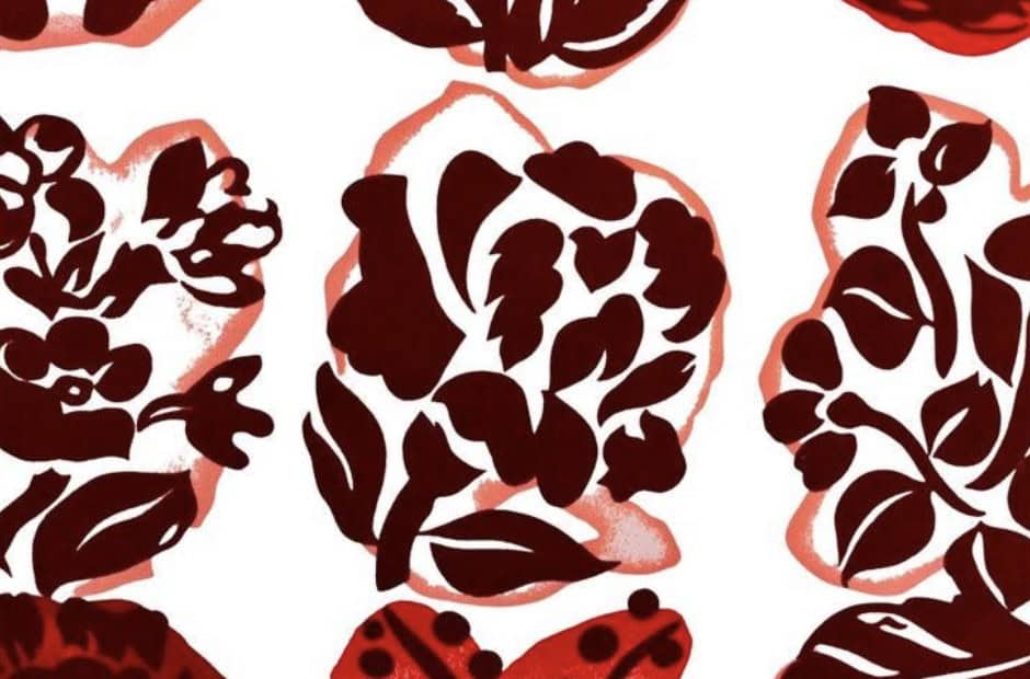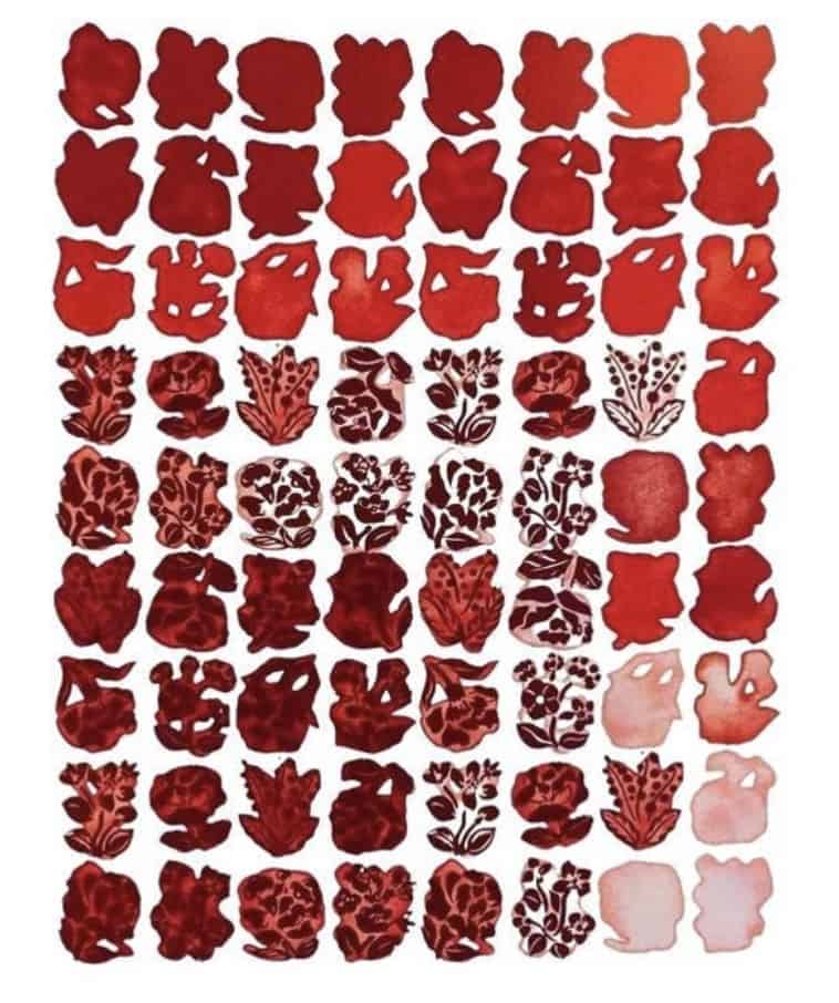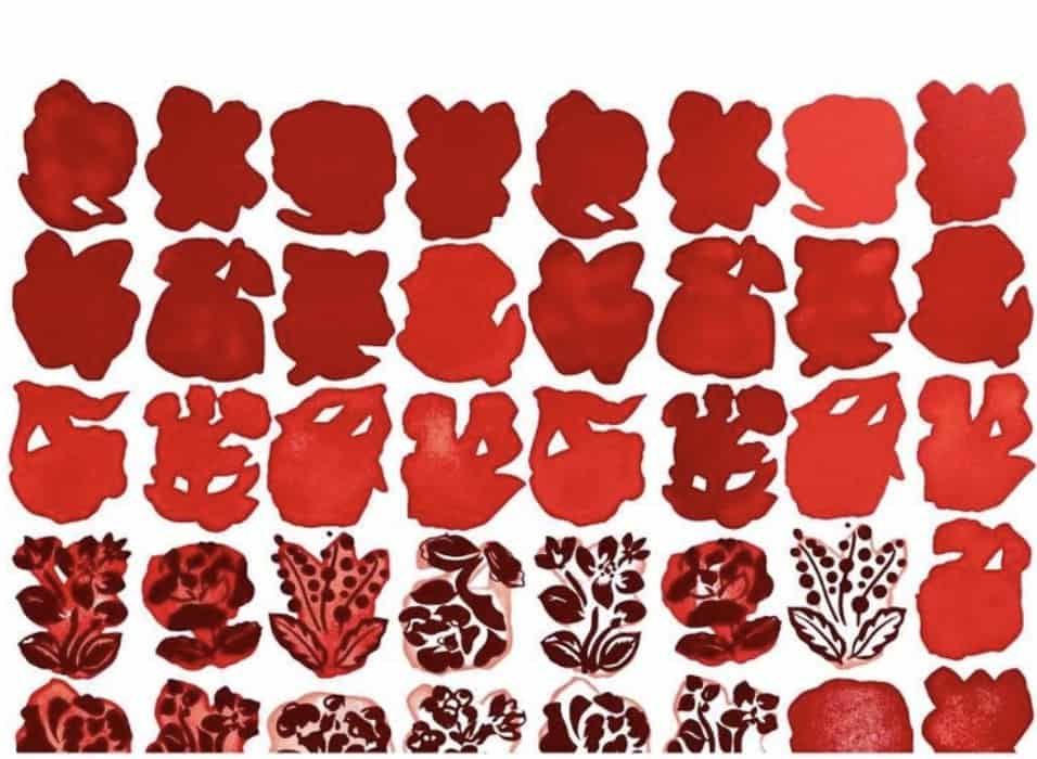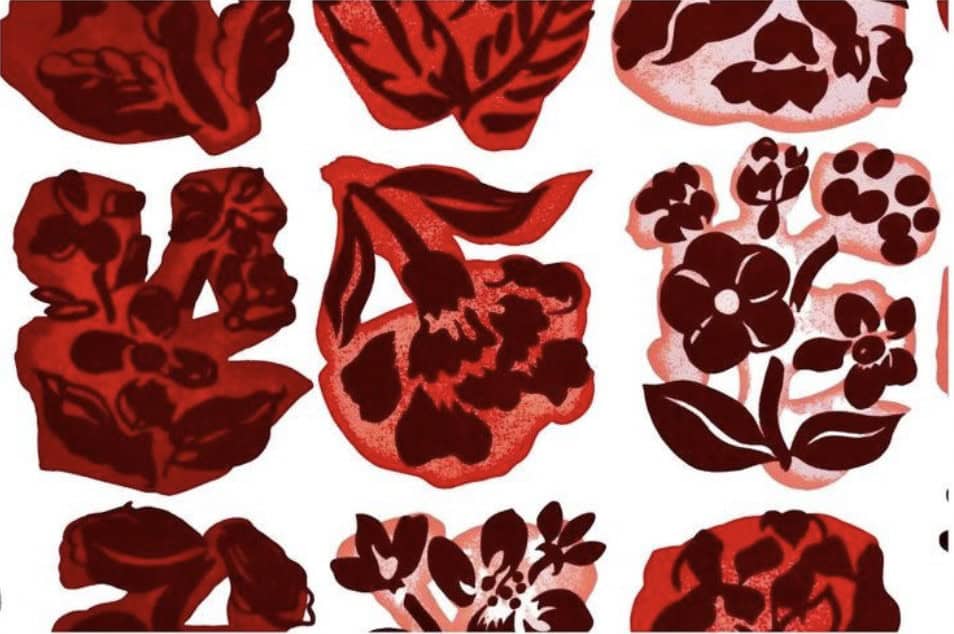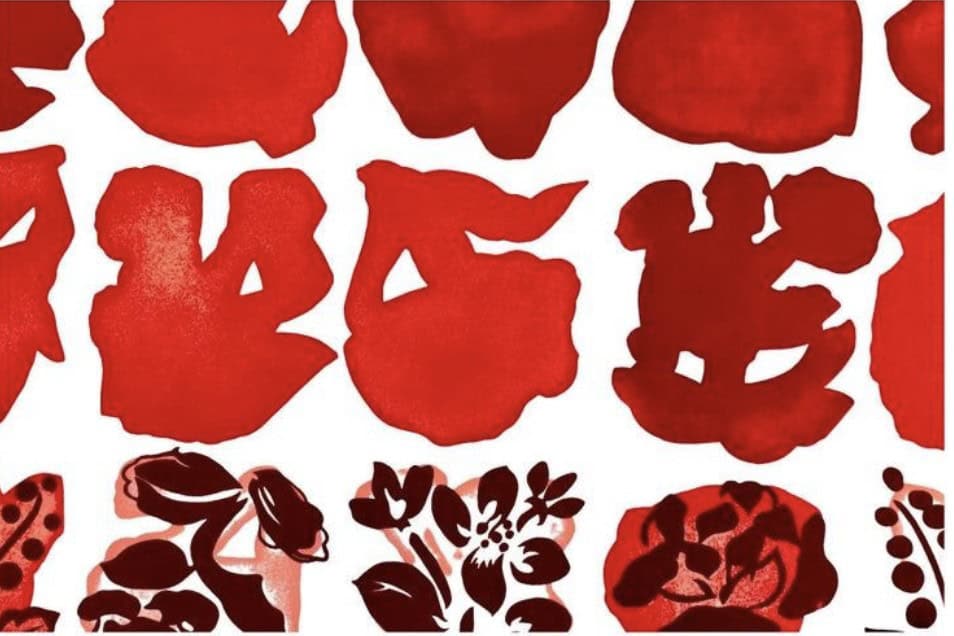 A rare wall screen print from an original sketch by Raoul Duffy, the panel on a white cotton background is screen printed with stylized flowers, ranging in color from deepest red to lightest.